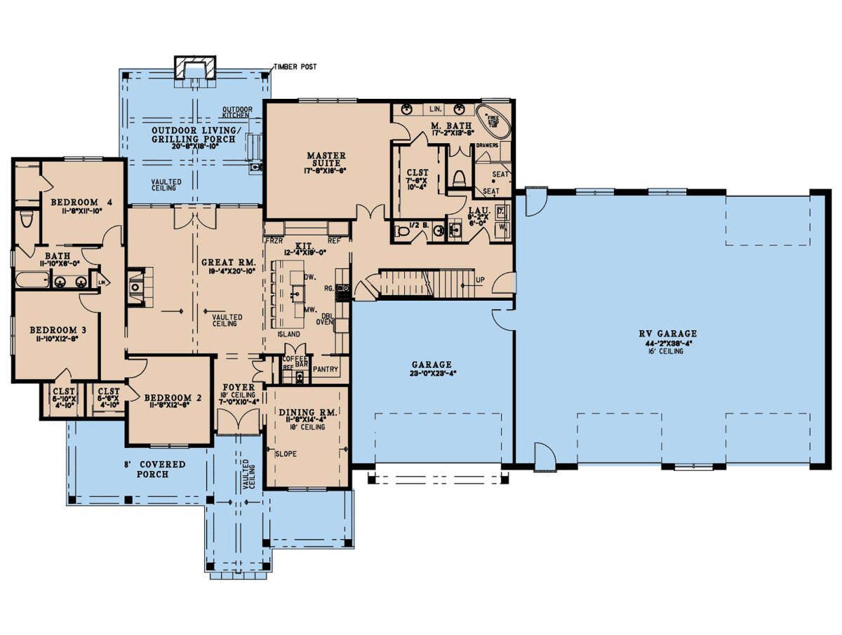 - Layout Highlights: Split bedrooms, primary suite on main level, open floor plan, kitchen island, laundry on main level, front and rear porches, RV bay