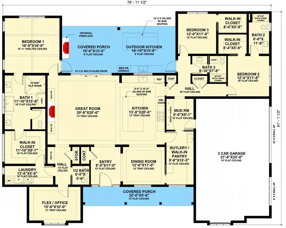- Great Room Ceiling: 13′ tray