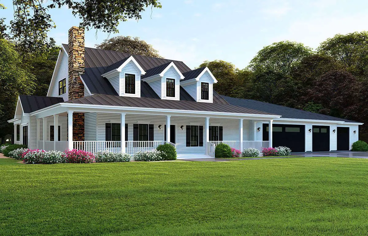 The exterior showcases classic farmhouse proportions with clean lines, board-and-batten siding details, and large windows that bring natural light inside. A broad, covered front porch sets a welcoming tone and provides space for seating and seasonal décor. The home’s footprint — about 56’-10″ wide by 74’-4″ deep — suits both suburban and rural lots, offering presence without feeling oversized. A side-entry two-car garage keeps the front elevation refined and welcoming.