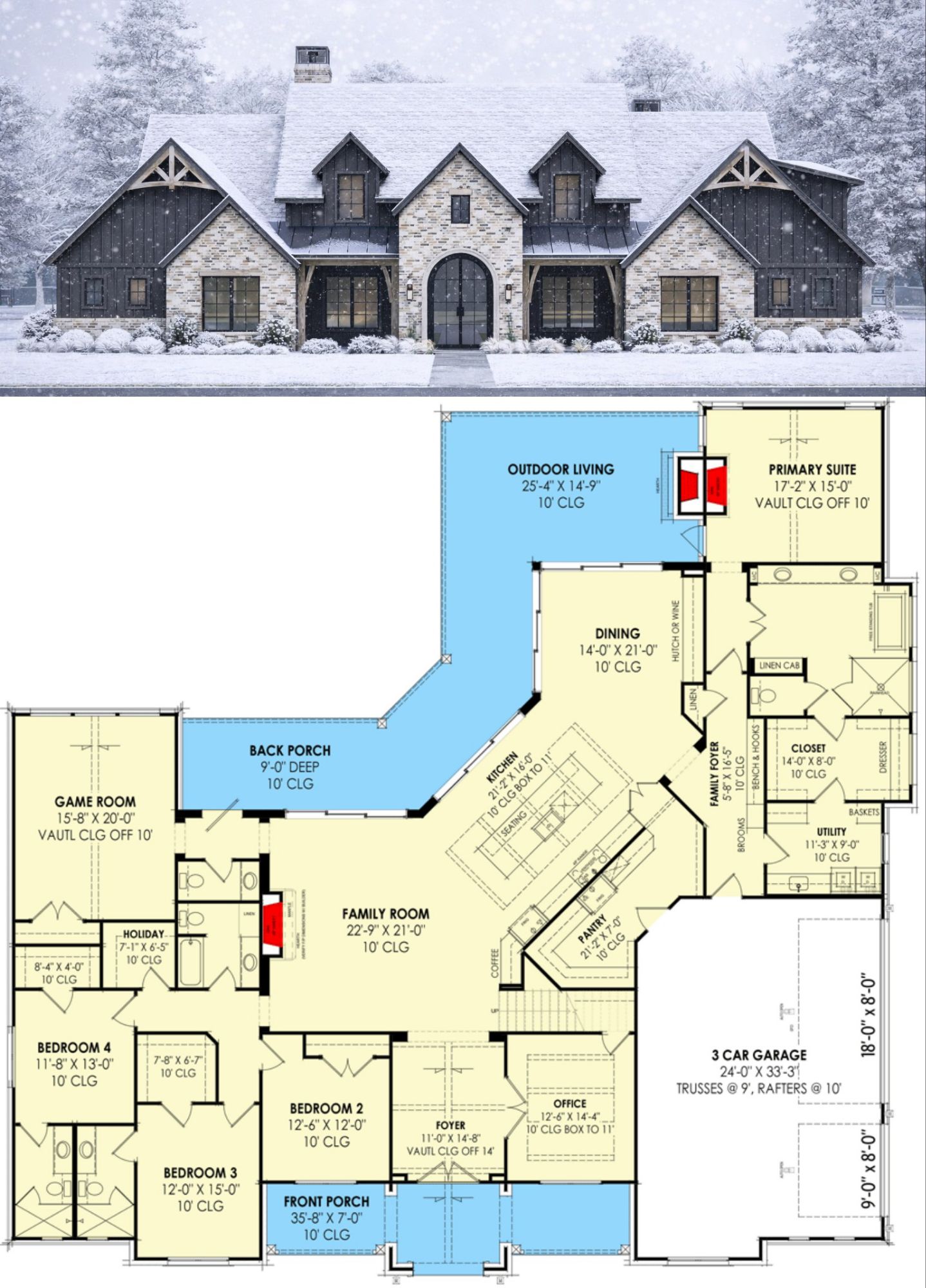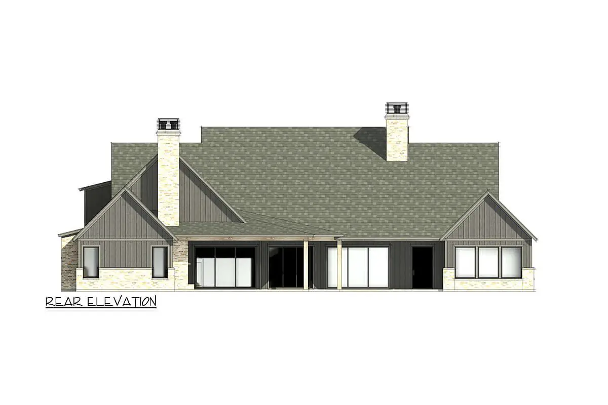This transitional home plan is designed for families and gatherings who value practical living without sacrificing balance and style. The symmetry of the design creates a visually pleasing façade and interior flow. Gatherings are effortless thanks to connected living spaces, while separated bedroom zones provide privacy. The generous bonus room adds future flexibility — perfect for growing families or evolving needs — and outdoor porch areas extend usable space for relaxation and socializing.