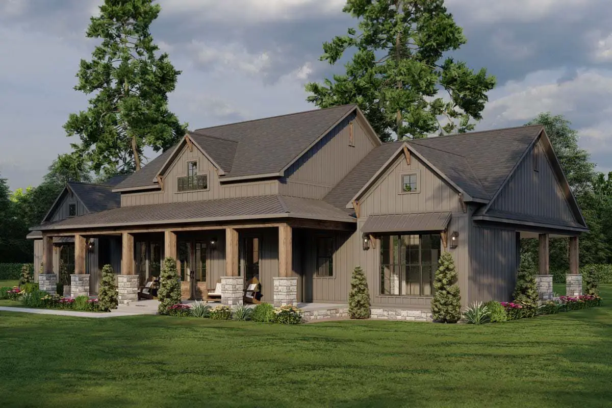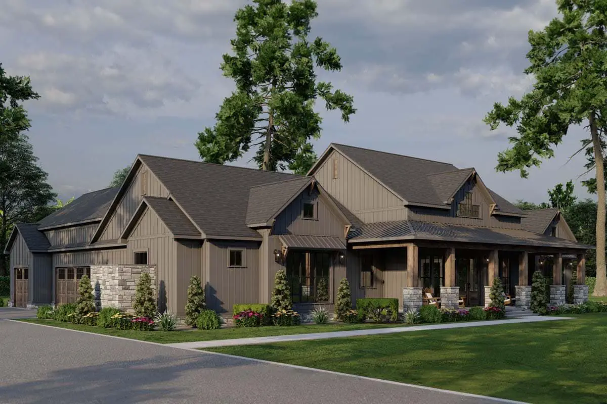 The front porch brings authentic farmhouse charm and provides a relaxing spot for seating, while the side-entry three-car garage keeps the façade open and inviting. (architecturaldesigns.com)