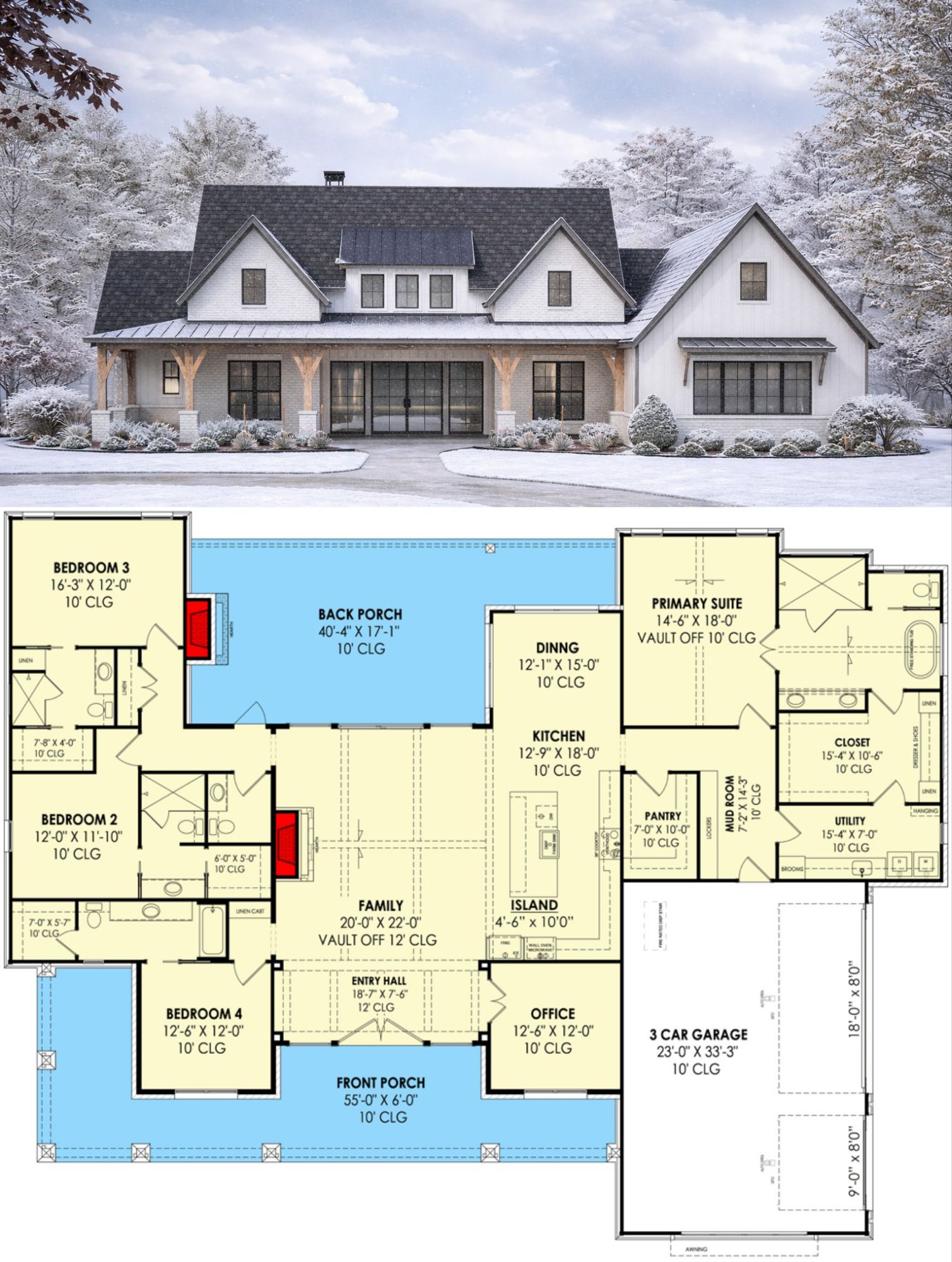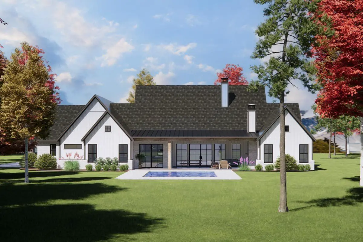This modern farmhouse plan offers versatile living for families and hosts alike. The open gathering spaces and sightlines make everyday routines feel natural and connected, while private zones like the primary suite and home office support restful retreats and focused work. Covered outdoor living areas expand usable space year-round and encourage indoor-outdoor enjoyment. Thoughtful touches like master laundry access and a dedicated office make life more efficient and comfortable.