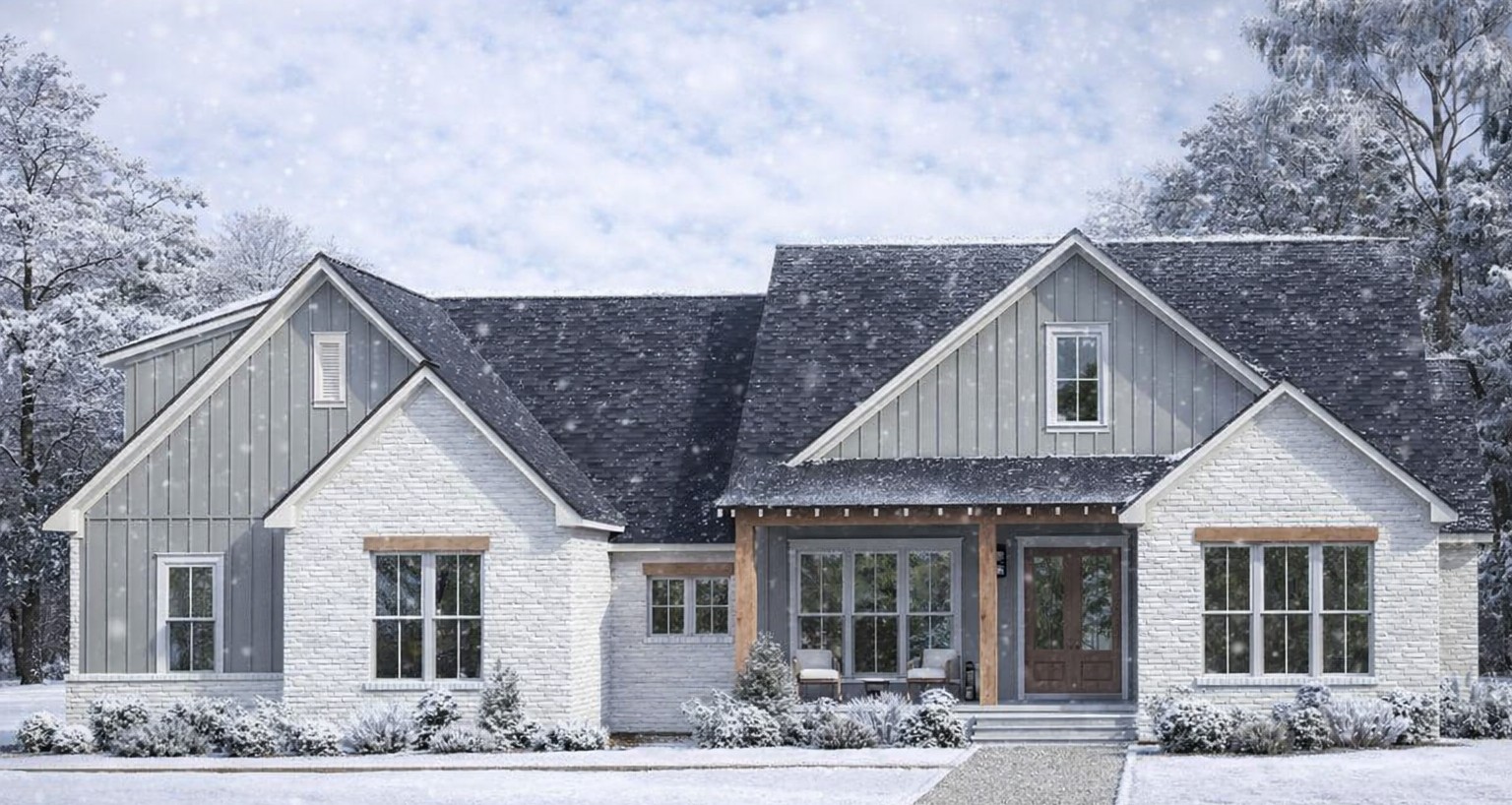 The exterior presents classic modern farmhouse charm with balanced proportions, board-and-batten siding, and tall windows that let light flood the interior. A welcoming covered front porch helps define the home’s curb appeal, providing space for seating, seasonal décor, and relaxed greetings with neighbors. The overall footprint — about **76’-6″ wide by 58’-4″ deep** — fits easily on suburban or countryside lots while maintaining a strong presence from the street.