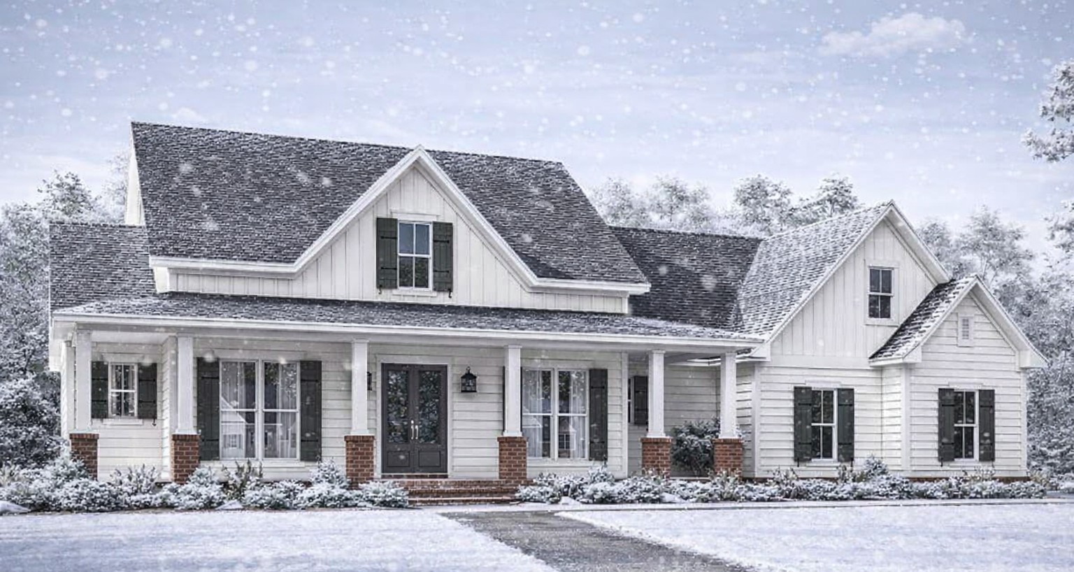 The exterior of this home brings classic country charm with balanced proportions, a welcoming covered front porch, and a thoughtfully arranged façade.