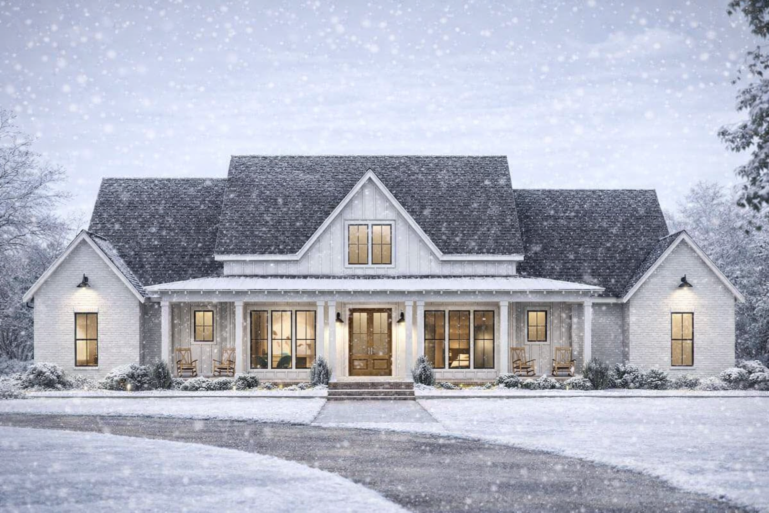 This home’s façade highlights perfect symmetry with clean modern farmhouse lines, balanced roof pitches, and thoughtfully placed windows that flood the interior with light. Board-and-batten siding, vertical accents, and classic trim details give it a timeless yet contemporary curb appeal. A welcoming covered front porch anchors the design and sets a warm tone for everyday living and arrival moments.