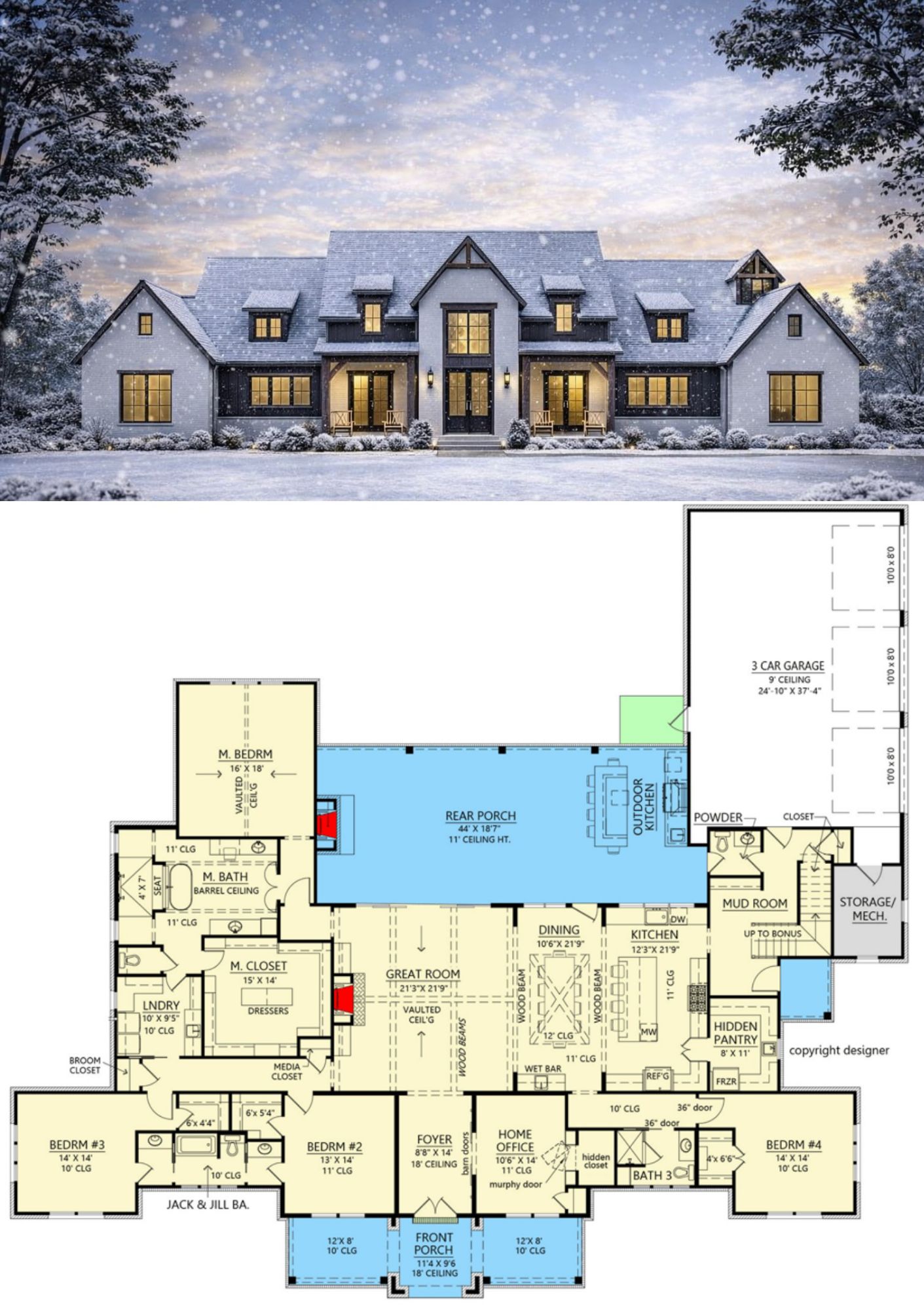 Featuring **four bedrooms**, **three full bathrooms and one half bath**, and phenomenal outdoor living with both an **outdoor kitchen** and **fireplace**, this plan is ideal for families who love entertaining, indoor-outdoor connection, and refined farmhouse character.