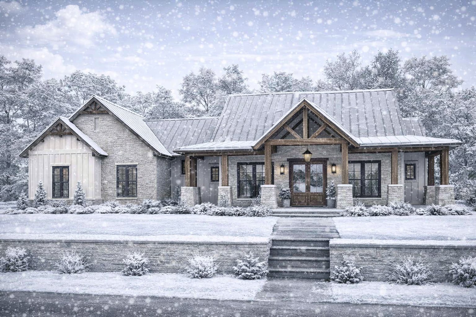 The exterior showcases modern farmhouse character with clean rooflines, vertically oriented siding with board-and-batten accents, and abundant windows that invite natural light inside. A welcoming **covered front porch** provides curbside charm and a comfortable spot for outdoor seating, while the façade’s balanced proportions make this home feel grounded and gracious. This design fits a variety of property types, from rural acreage to quieter suburban streets.
