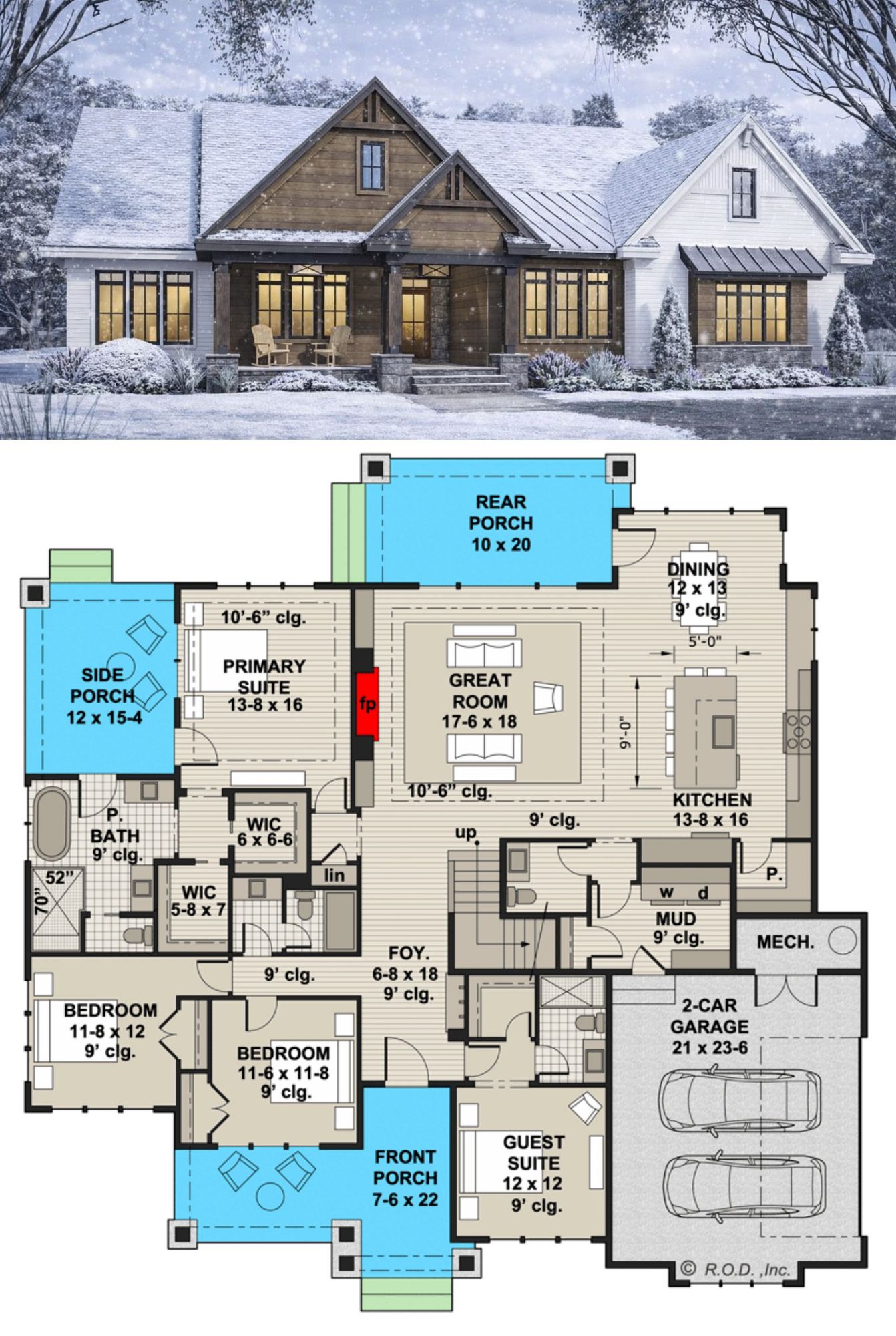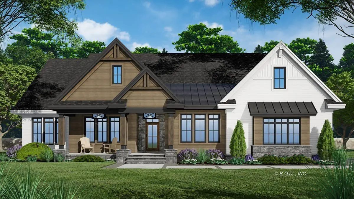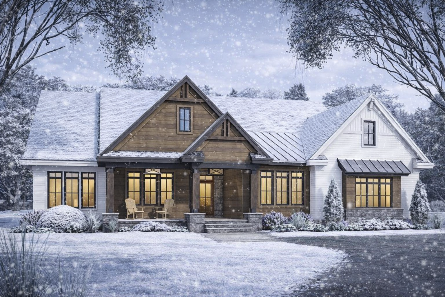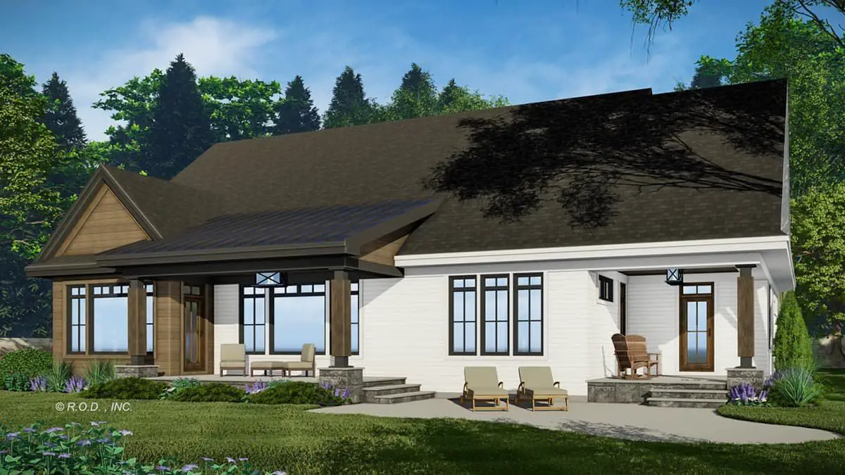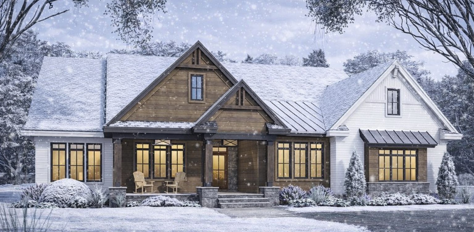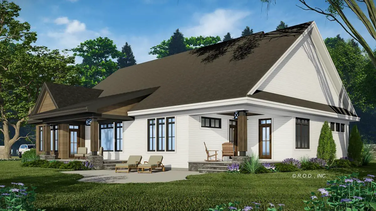 This transitional modern farmhouse plan is ideal for families who appreciate open interior living zones that flow naturally and private retreats that support everyday routines. Generous outdoor porch spaces extend functional living areas while providing shaded environments for relaxation and entertainment. Thoughtful bedroom placement ensures privacy and comfort, while flexible spaces like the home office help balance work and life. Practical storage, a dedicated laundry room, and a mudroom help keep the home organized and calm even during busy days.