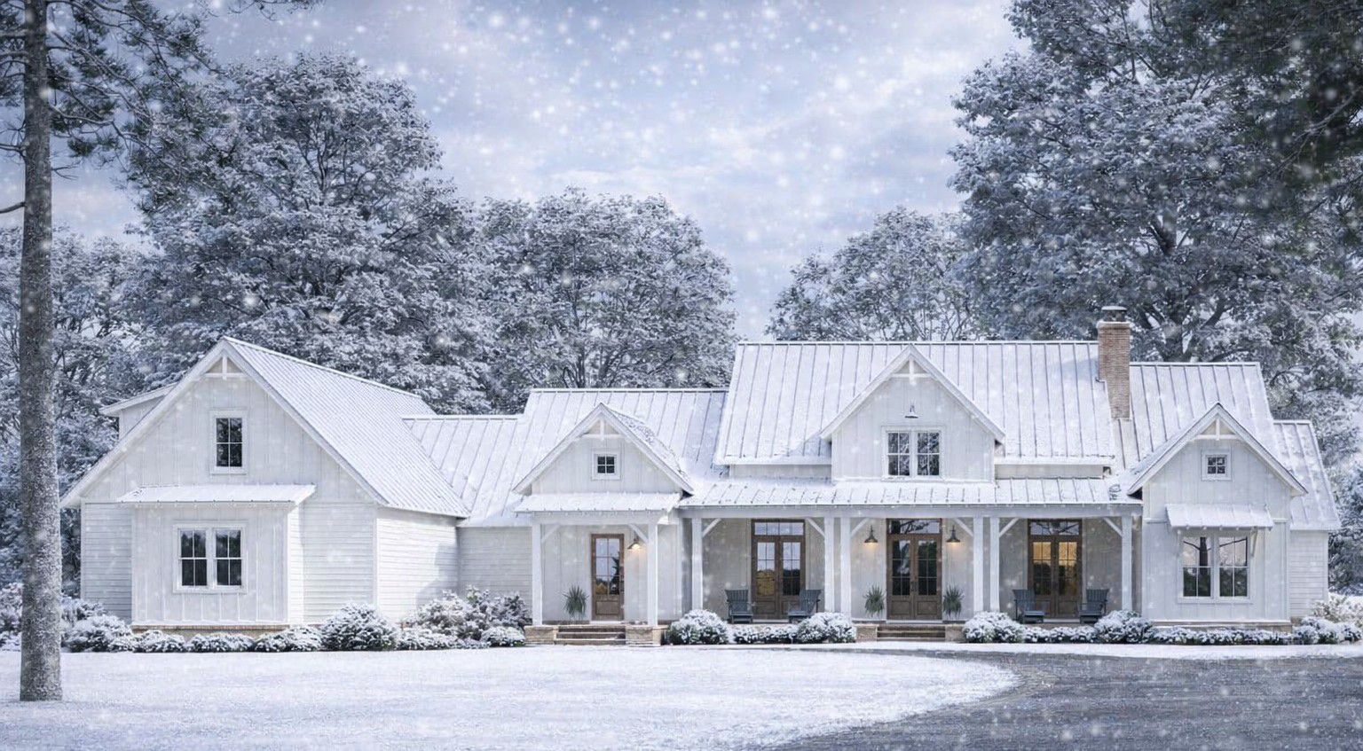 The exterior blends classic farmhouse charm with a modern edge through board-and-batten siding, clean rooflines, and crisp trim details. A welcoming covered front porch sets the tone with inviting proportions that feel both timeless and approachable. Carefully placed windows bring abundant natural light into the home, enhancing the visual depth and warmth of the exterior.