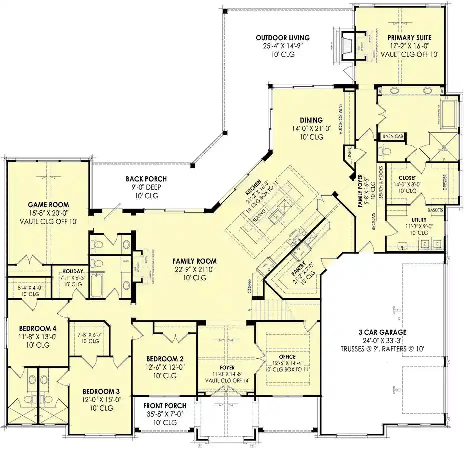 The attached **three-car garage** provides secure parking and extra storage for vehicles, tools, and seasonal gear. Its placement supports practical access and keeps exterior lines balanced. Ceilings throughout key living spaces are approximately **9–10 feet** high, helping maintain a welcoming and open interior feel.