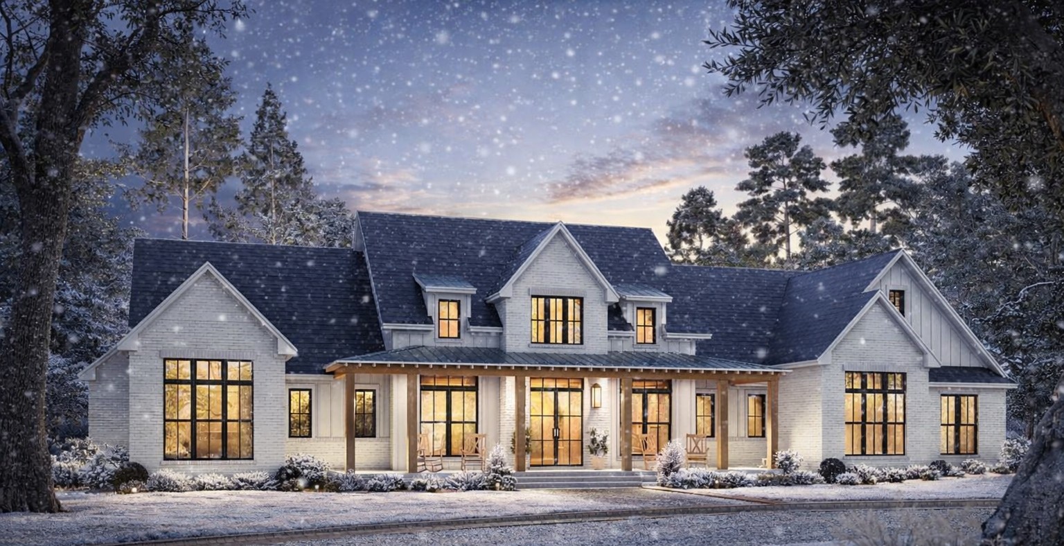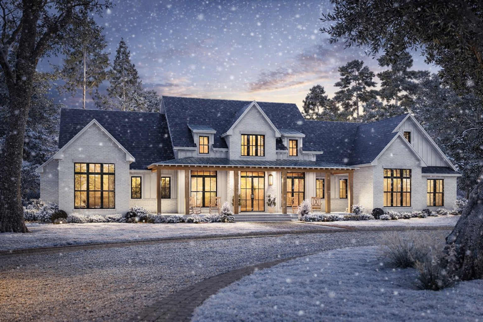 A generous covered front porch defines the entry and instantly sets a warm, approachable tone. Carefully placed windows bring natural light deep into the interior, while the balanced massing gives the façade a refined, anchored feel. (architecturaldesigns.com)