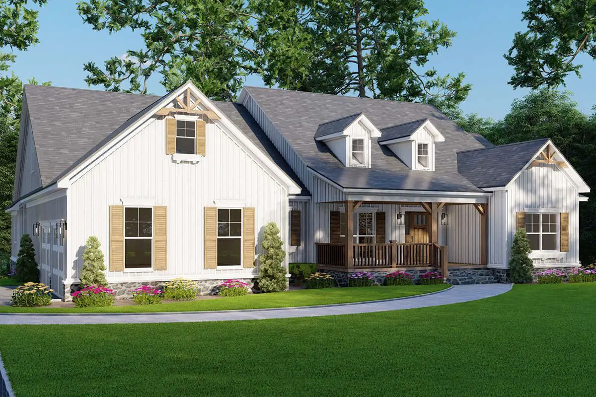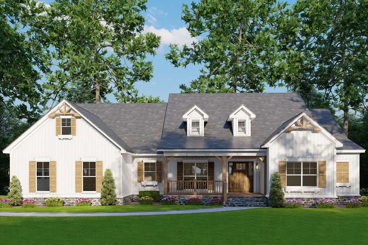 This modern farmhouse plan is ideal for families who appreciate open living zones and stylish architectural details. Its central gathering spaces make it easy to host family dinners, celebrations, or quiet evenings at home. Private bedroom zones and multiple full baths help daily living flow smoothly, while covered porch areas invite you to enjoy fresh air and outdoor living comfortably. Thoughtful storage, dedicated laundry space, and flexible zones like a secondary bedroom or office help make daily routines organized and adaptable as your lifestyle evolves.