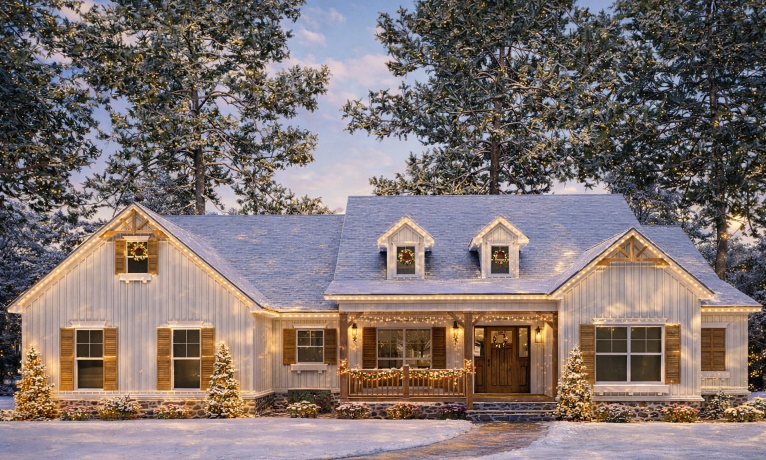This home’s proportions are grounded and inviting, suitable for both wide countryside lots and suburban neighborhoods.