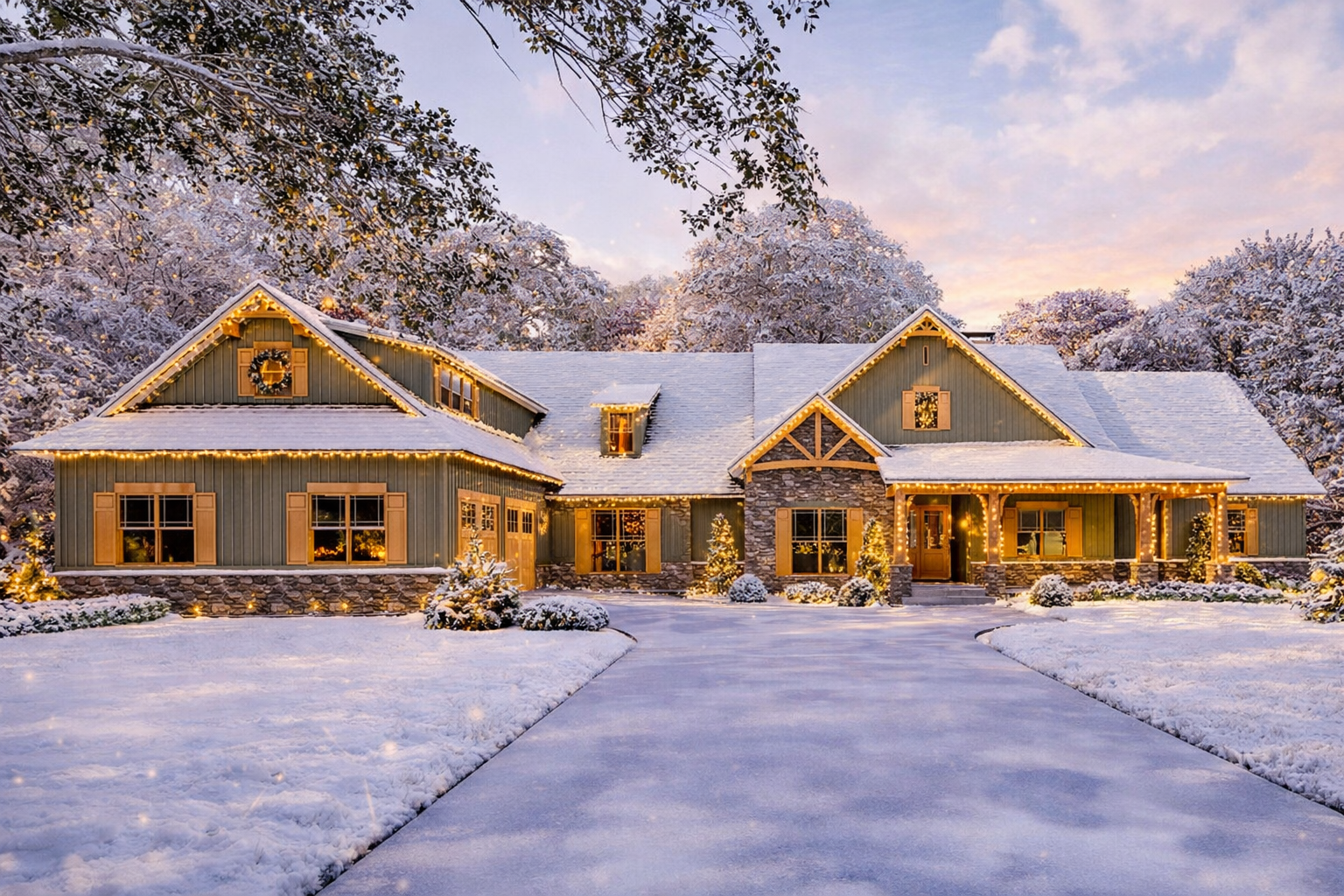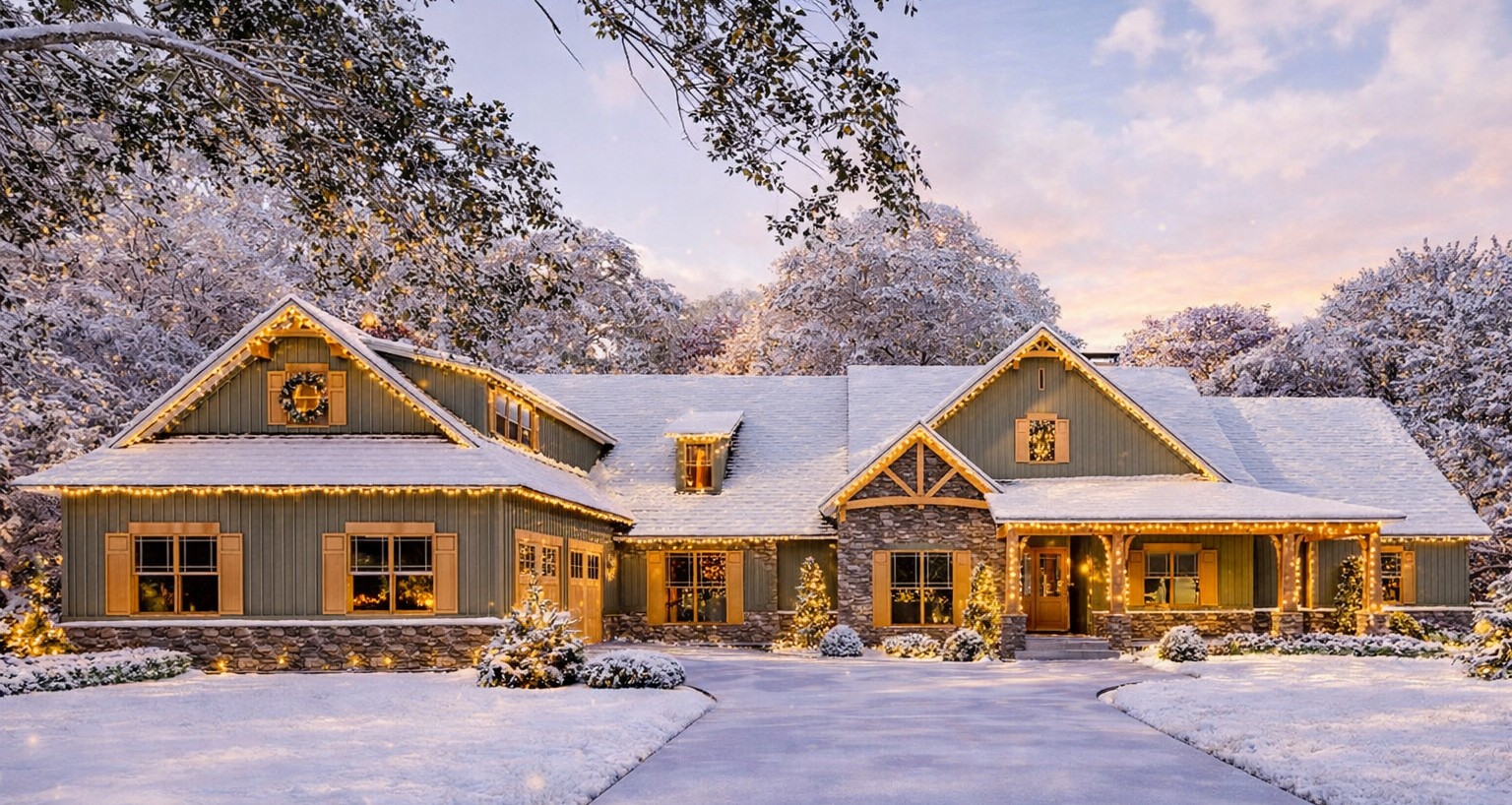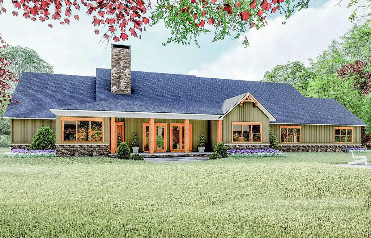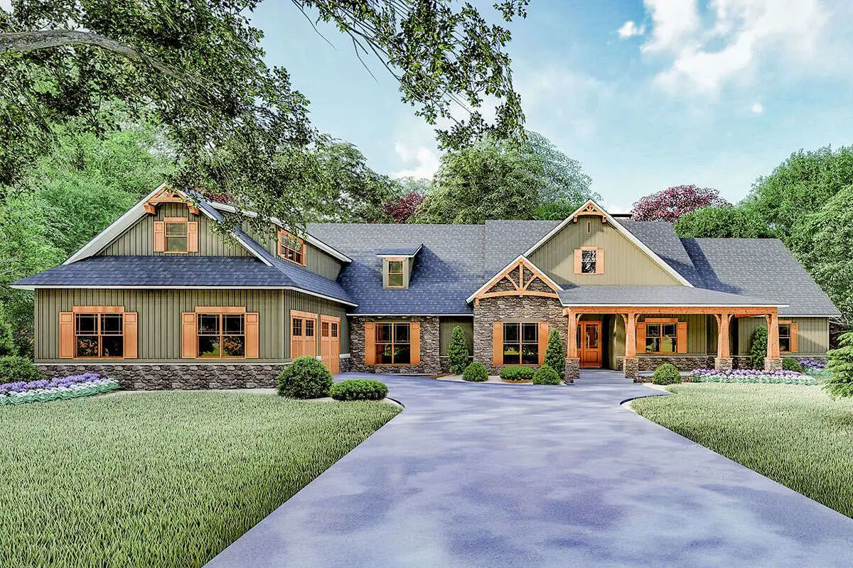 The exterior is designed with timeless country character — broad rooflines, balanced gables, and plenty of windows that catch natural light and enhance the home’s welcoming presence.