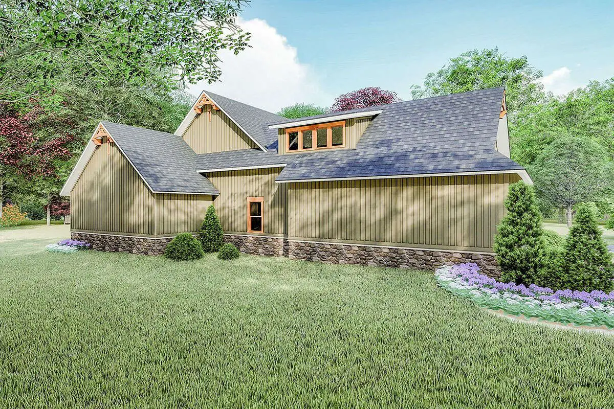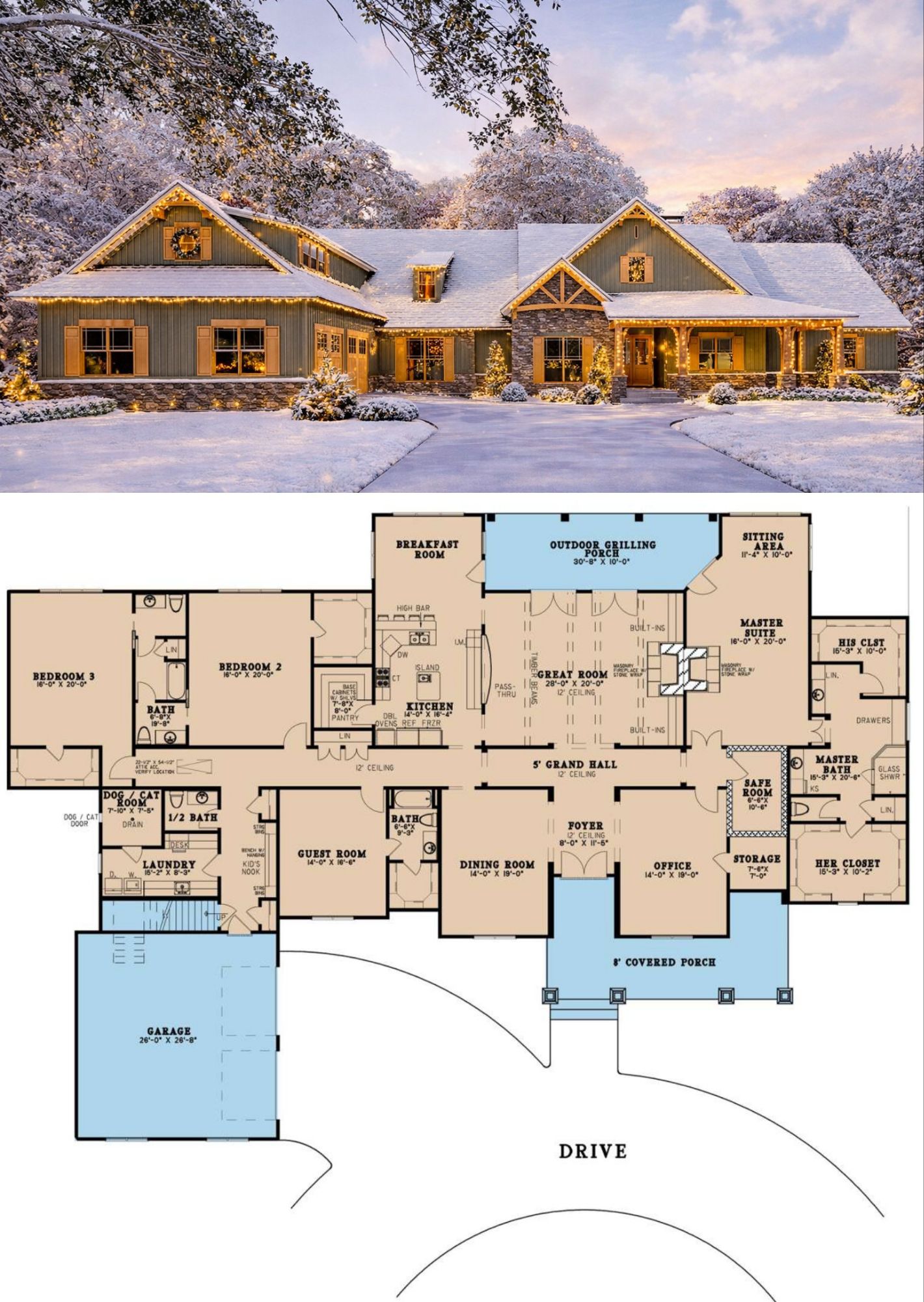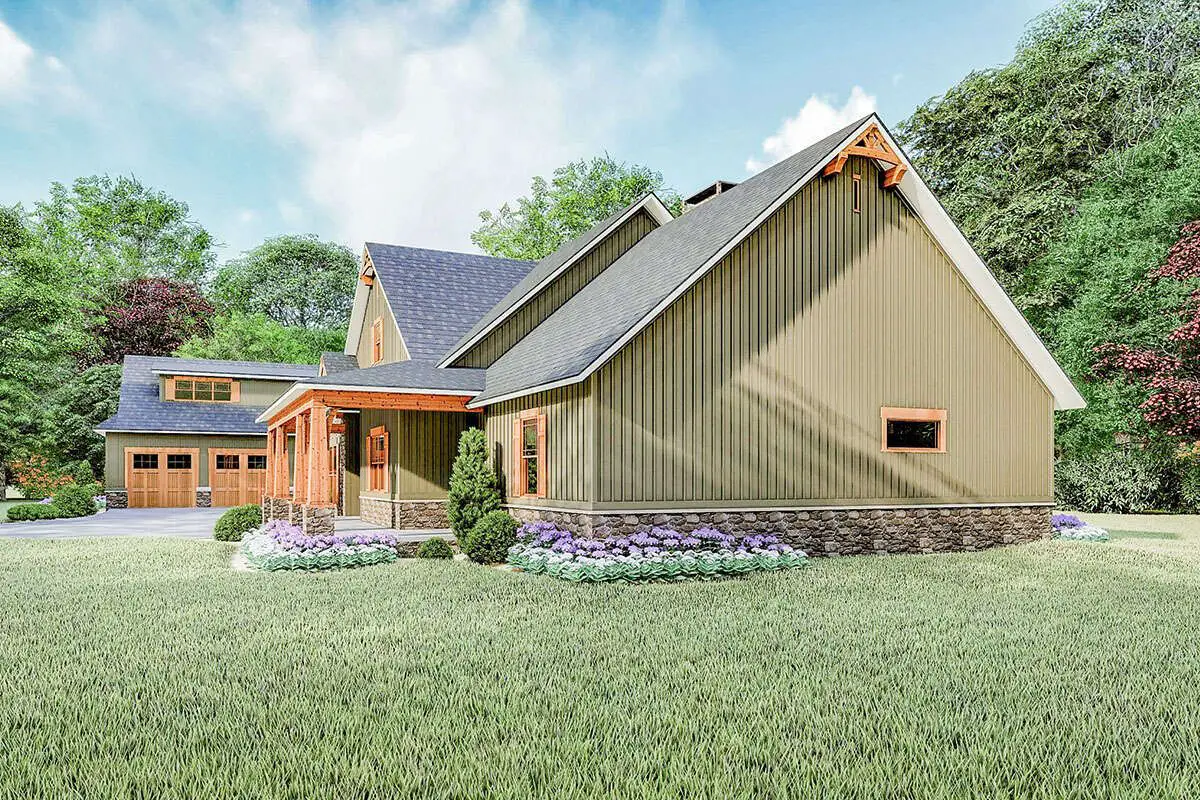 The exterior is designed with timeless country character — broad rooflines, balanced gables, and plenty of windows that catch natural light and enhance the home’s welcoming presence.