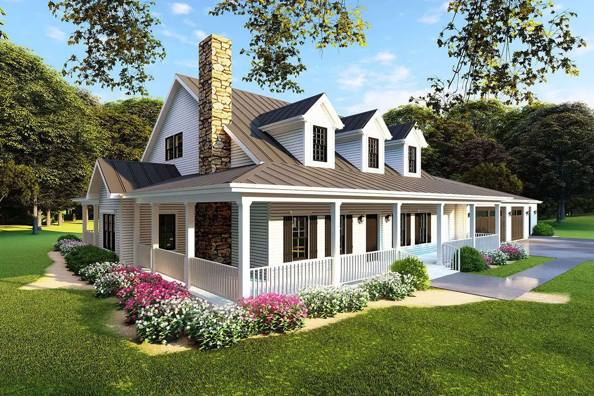 This impressive farmhouse plan offers approximately 3,416 square feet of thoughtfully arranged living space that combines classic farmhouse charm with everyday livability.