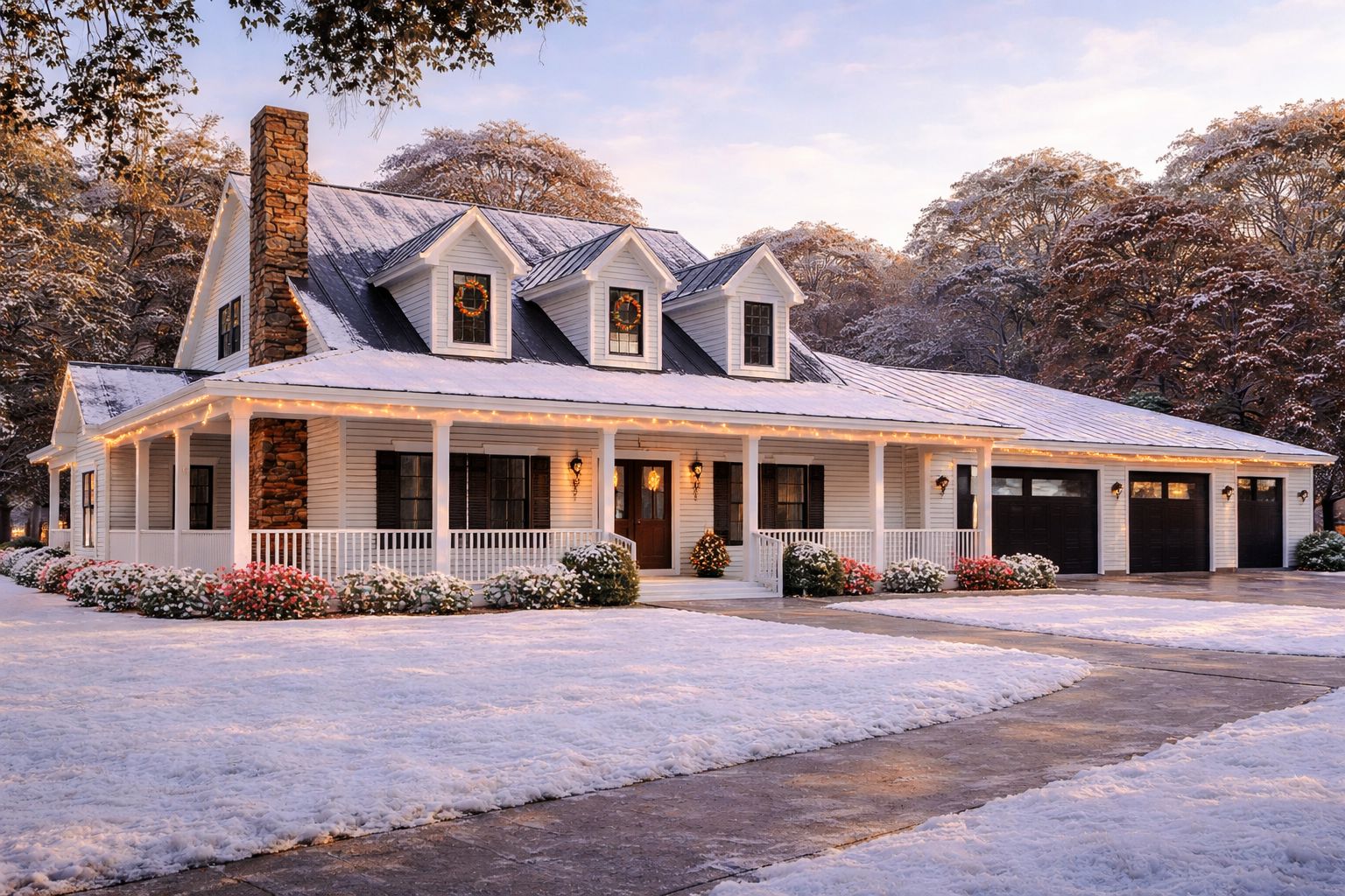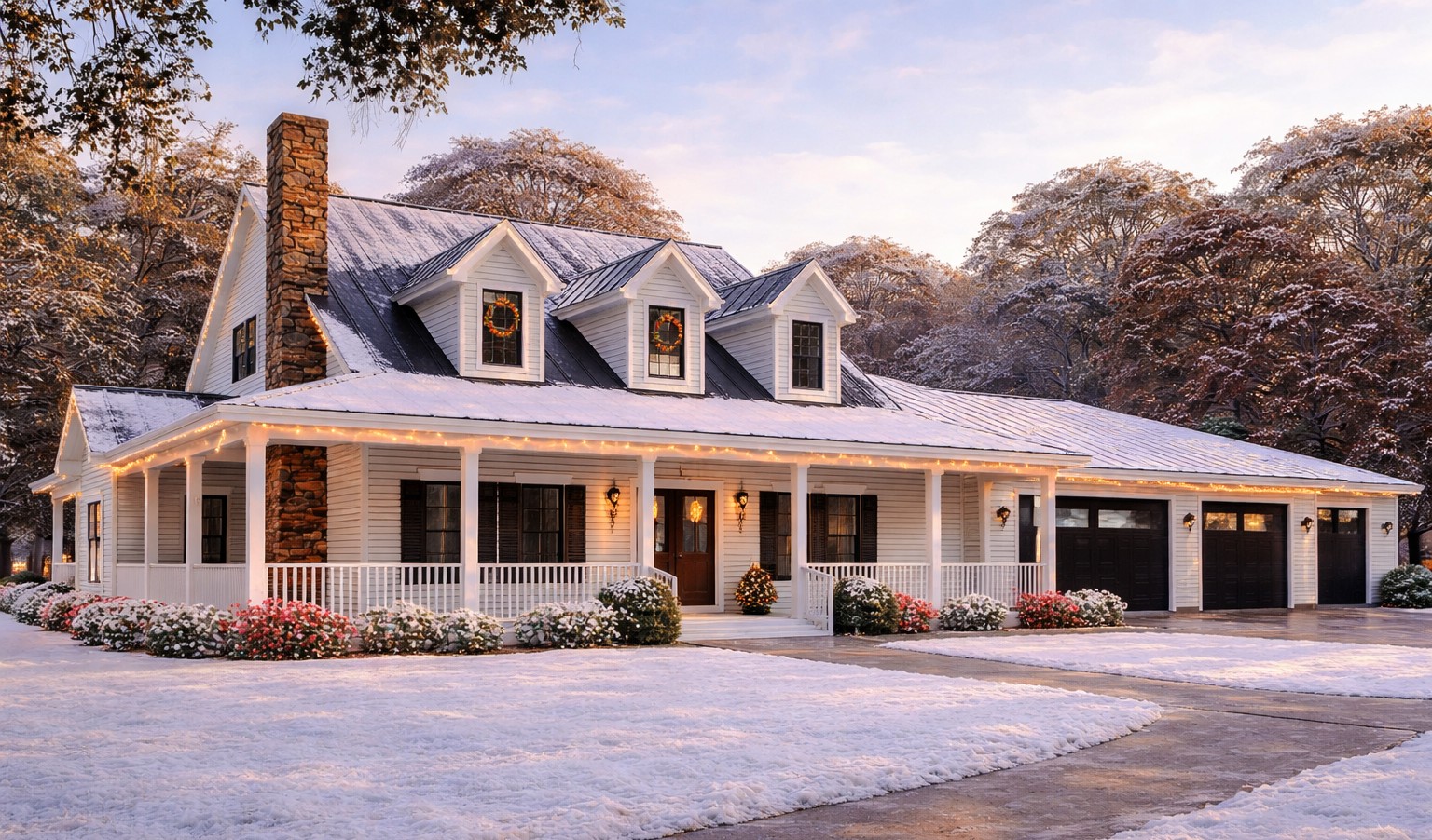 The exterior presents timeless farmhouse character with board-and-batten siding, balanced rooflines, and a welcoming covered front porch.