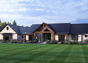 With a generous footprint (about 87′ 2″ wide × 61′ 4″ deep), this farmhouse makes an elegant statement. Its singular gabled roof, wraparound porch, and symmetrical layout echo timeless charm with a modern edge. 2