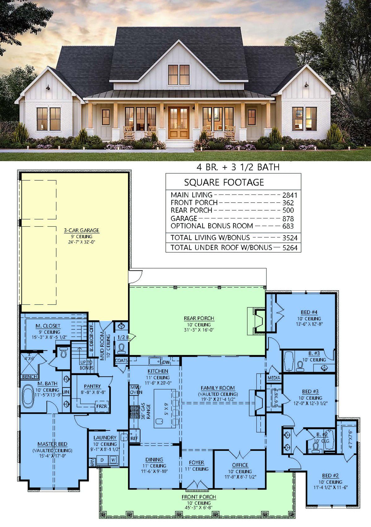 This spacious New American farmhouse offers around 2,841 sq ft of heated living, with 4 bedrooms, 3.5 baths, an attached 3-car garage, and a sizable bonus room above the garage.