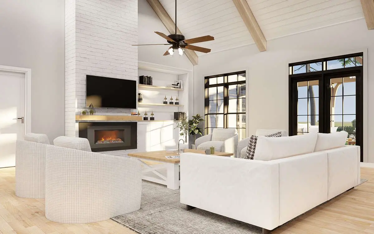 This single-story modern transitional design offers about 2,886 sq ft, configured with 3–4 bedrooms, 2.5 bathrooms, and a 2-car garage.