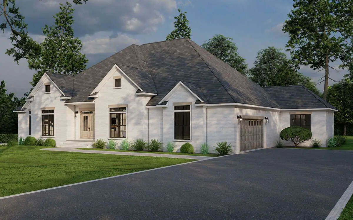 The modern transitional styling melds clean lines with warm textures—expect a mix of siding, roofing accents, and covered porches to welcome guests. 1