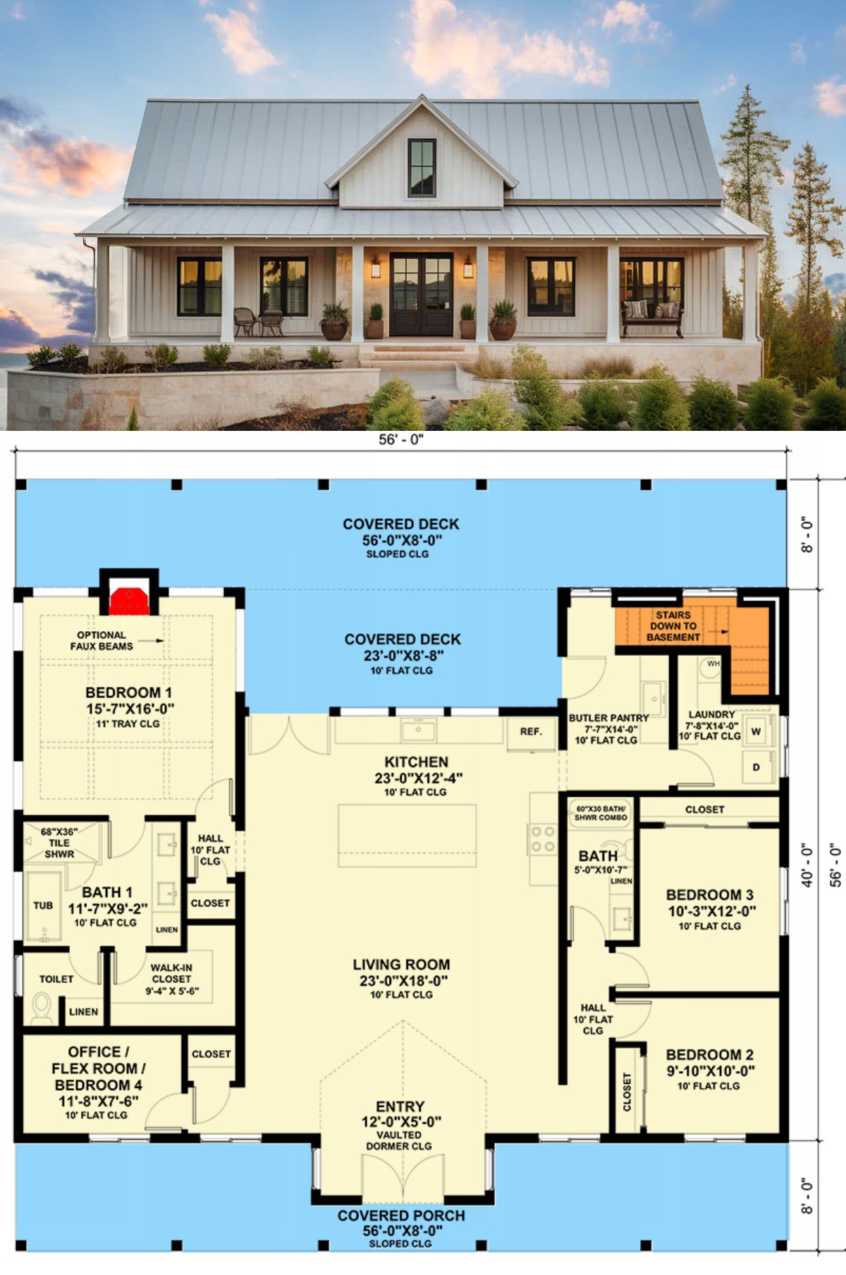 Hey you! Come walk through this modern farmhouse plan with me. It’s about 2,100 square feet, has 3 to 4 bedrooms, 2 full bathrooms, a flex room, and some seriously expansive outdoor living.