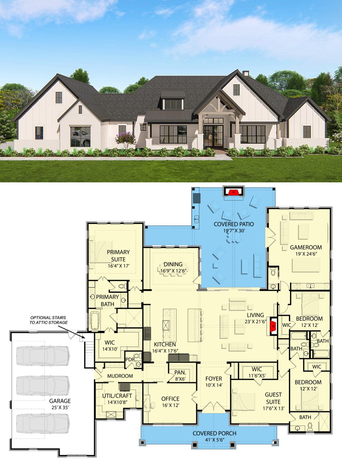 It strikes a sweet balance between elegance and comfort. With a private office, fun game room, and flexible bedroom count—all in a single-story home—it’s ideal for families, future proofing, or anyone who wants thoughtful design without excess.