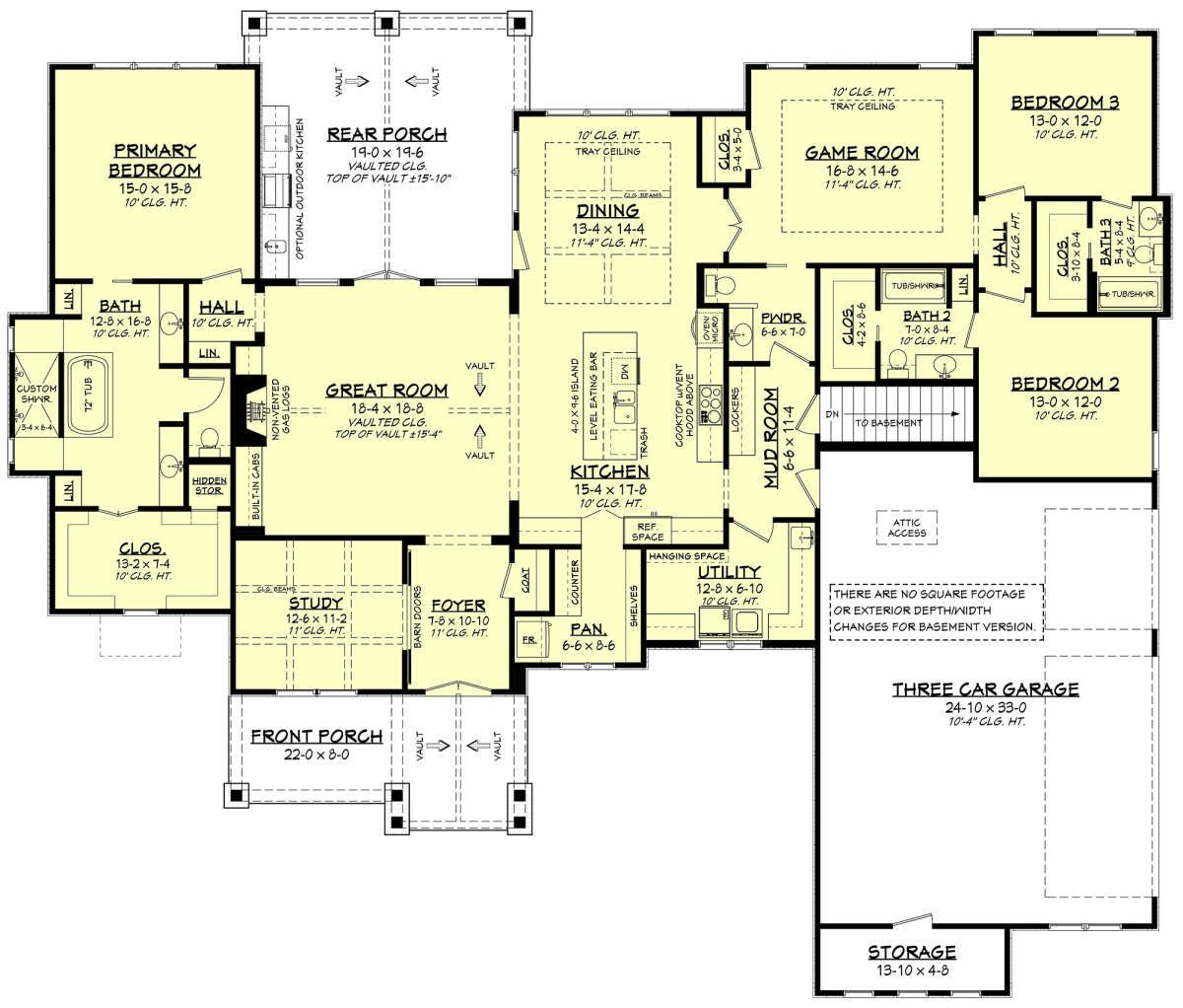 This one-level modern farmhouse clocks in at about 2,974 sq ft, offering 3 bedrooms, 3 full baths, 1 half bath, and a 3-car side-entry garage. With split bedrooms, vaulted living, mudroom, study, and generous porches, it’s loaded with comfort and flexibility. 0
