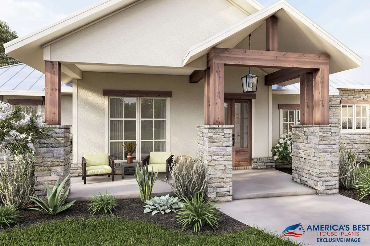 Wide front covered porch with warm beams, stacked stone accents, and board-and-batten siding make for serious farmhouse curb appeal. The roof has a 7:12 pitch, and overall dimensions are about 86′-8″ wide × 73′ deep. 1