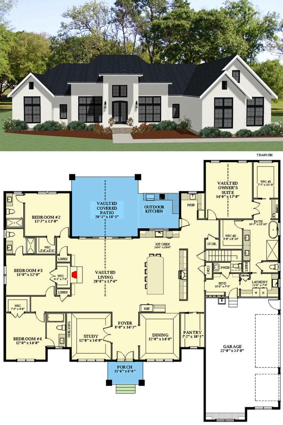 - Bedrooms: In addition to the owner’s suite, there are 2 or 3 more bedrooms depending on whether you use the study as an office or a guest room. Shared full and powder bathrooms are placed to serve them without intruding on privacy.