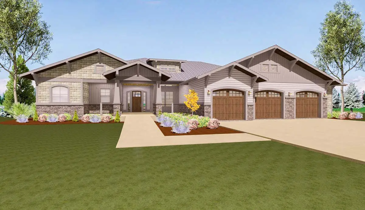 - Rustic exterior touches: Stone veneer, board-and-batten or cedar siding elements, large gables, perhaps decorative brackets, and timber details—hallmarks of rustic Craftsman style.