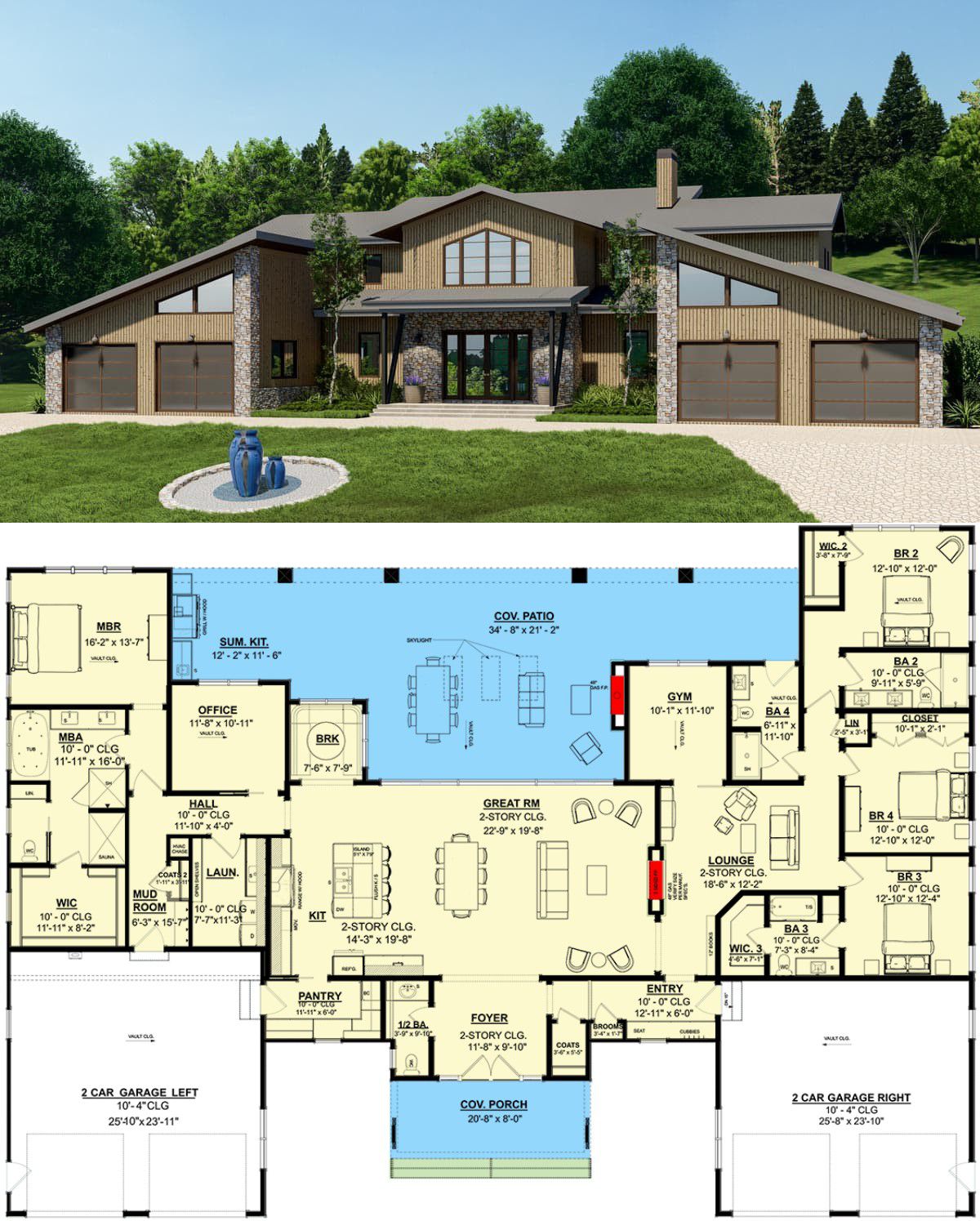 This striking modern-home plan delivers about 3,642 sq ft on one level, with 4 bedrooms, 4 full baths and 1 half bath, plus two matching 2-car garages (one on each wing).