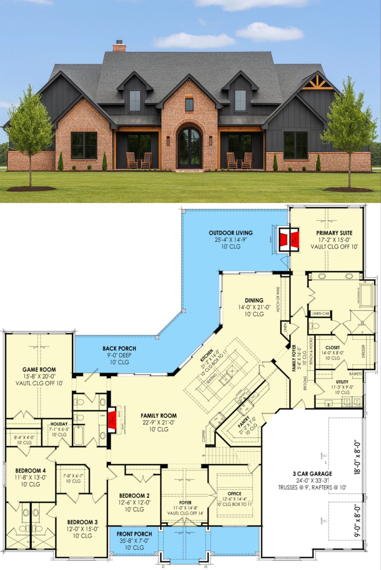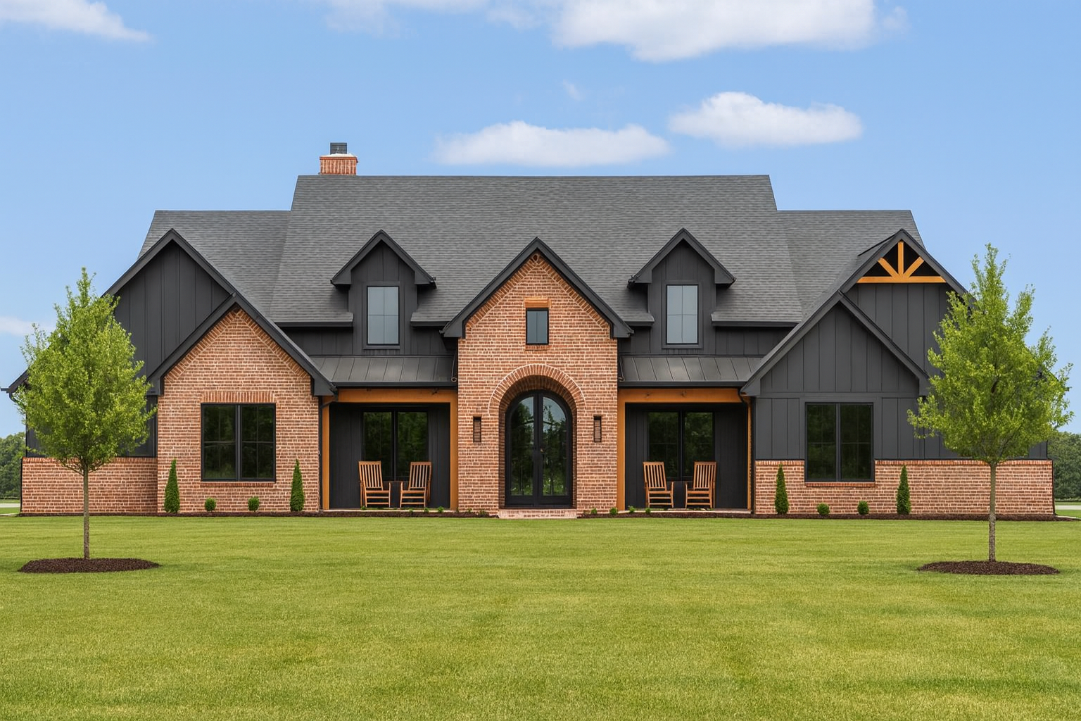 The façade brings together brick, wood, and metal accents in symmetrical balance. Twin gables, balanced windows, and an arched pair of French doors welcome you into a vaulted and beamed foyer that sets a warm and formal tone. 1