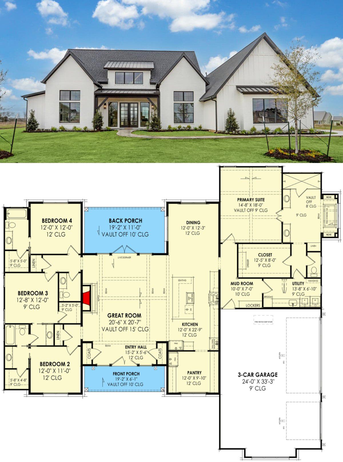 It scales beautifully—big enough for family life and hosting, yet compact and efficient. The vaulted great room offers drama and openness; the split wings preserve peace. It’s a transitional farmhouse that lives large without feeling oversized.