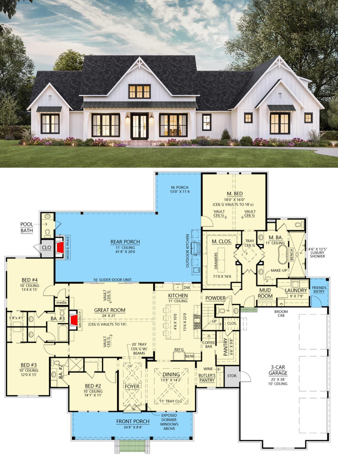 This beautiful modern farmhouse layout offers approximately 3,300 sq ft of living space (main level), featuring 4 bedrooms, 3.5 baths, and a **3-car garage** with expansion potential.