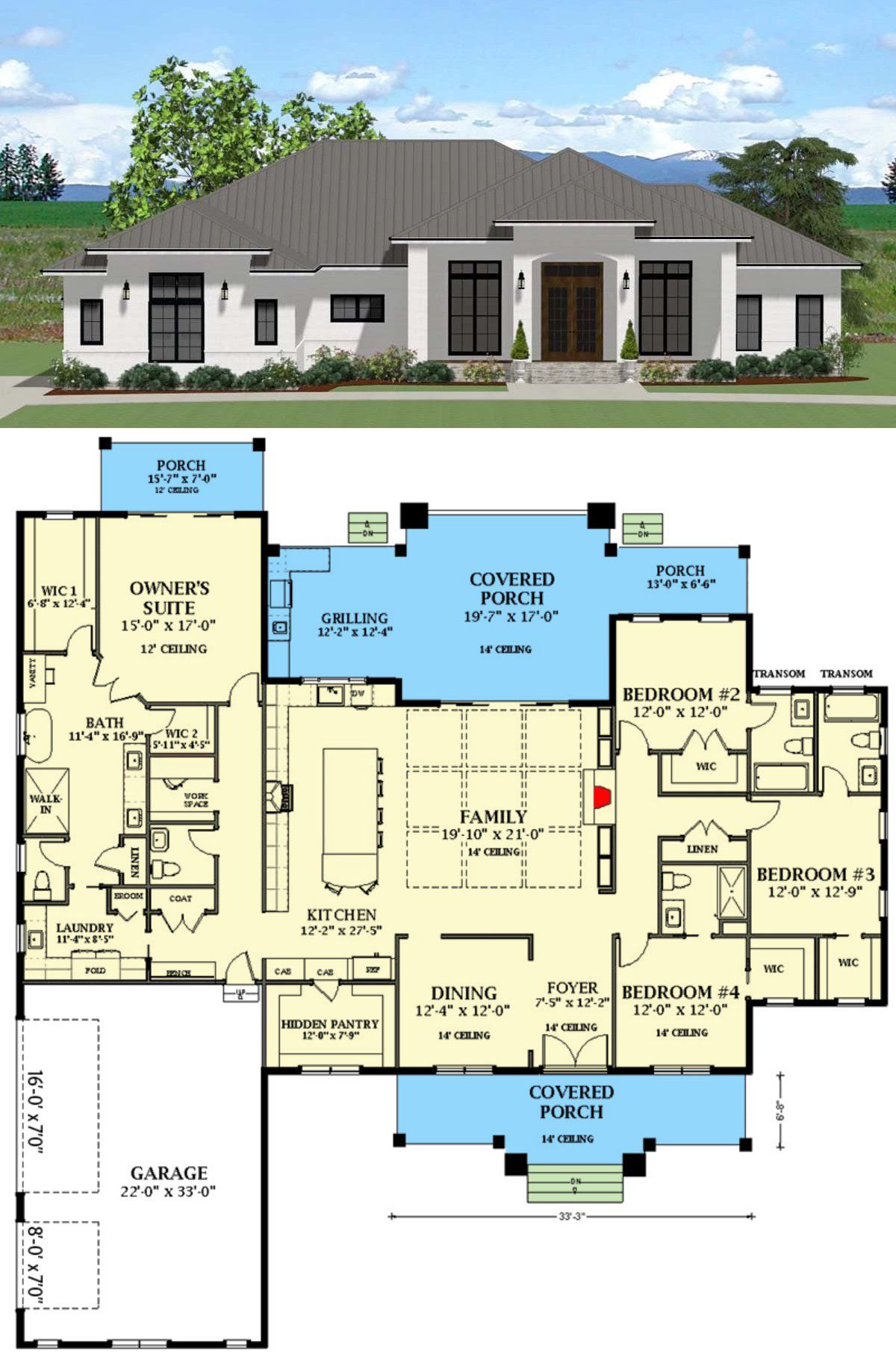 This transitional-style design spans about 3,046 sq ft, offering 4 bedrooms, 3 full baths plus a powder room, and a 3-car side-entry garage. It blends classic and modern touches in a layout that supports both family life and entertaining with ease.
