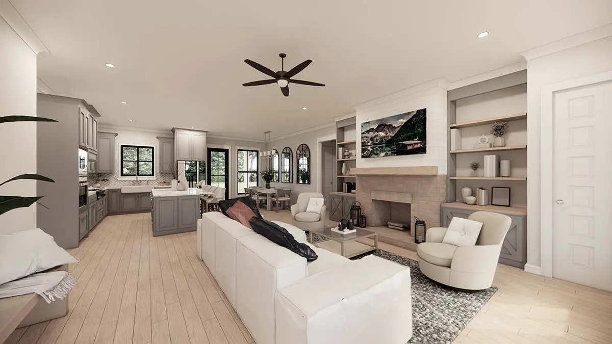 Step through double front doors into the great room—the heart of the home. Built-ins and a fireplace frame this space, and from here you move freely into kitchen, dining, and outdoor areas. 3