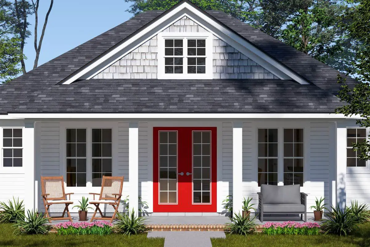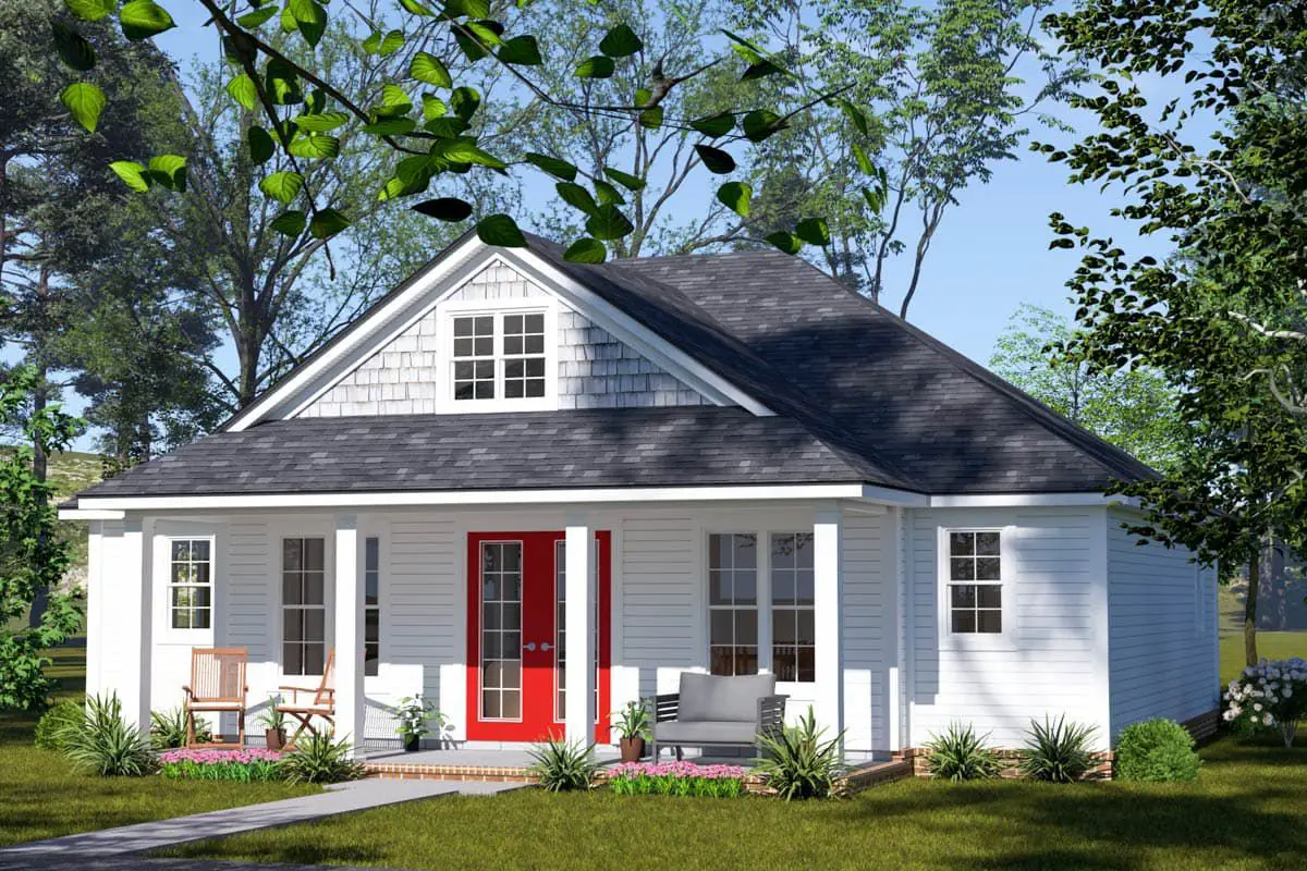 The exterior pairs cottage character with clean lines—gabled roofs, trim accents, and a welcoming covered entry. Inside, the foyer feeds directly into the open living area so your gaze connects spaces immediately.
