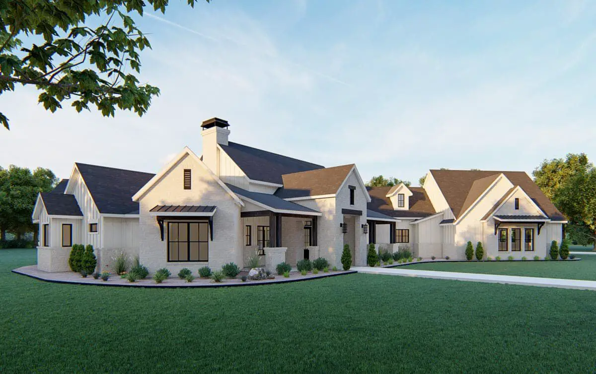 This standout home design delivers about 3,576 sq ft of heated living space—including 4 main-level bedrooms, 3.5 baths, and a clever bonus 5th bedroom above an angled 3-car garage.
