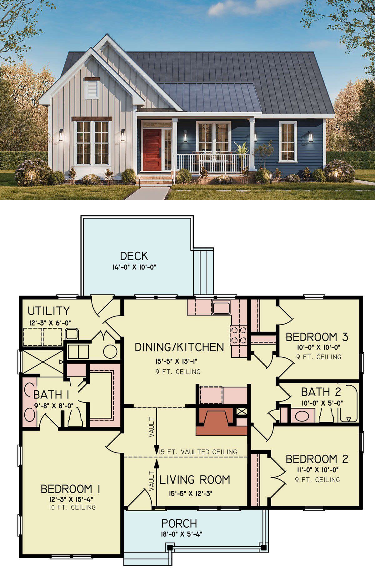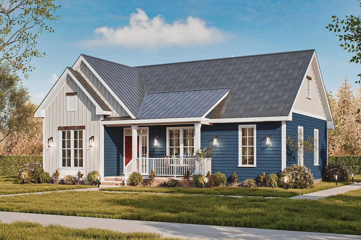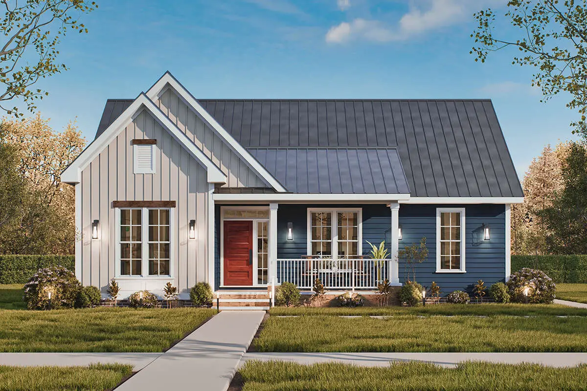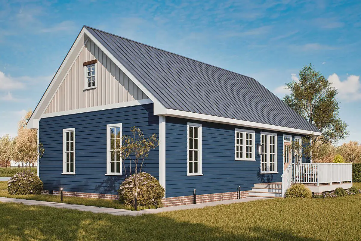 This cozy country design offers around 1,209 sq ft of smart living space in a compact footprint.