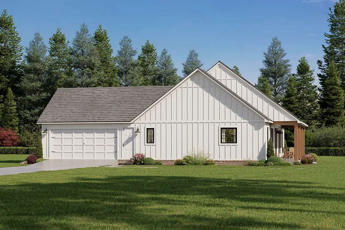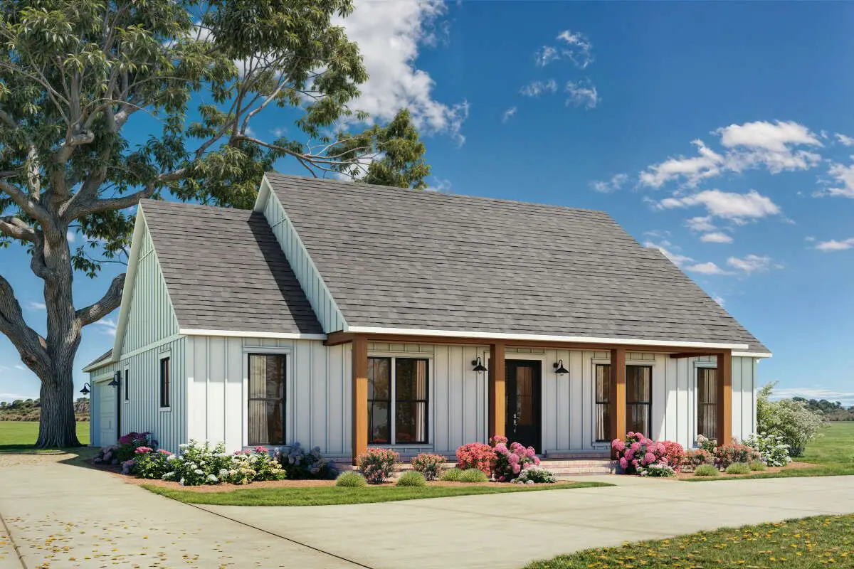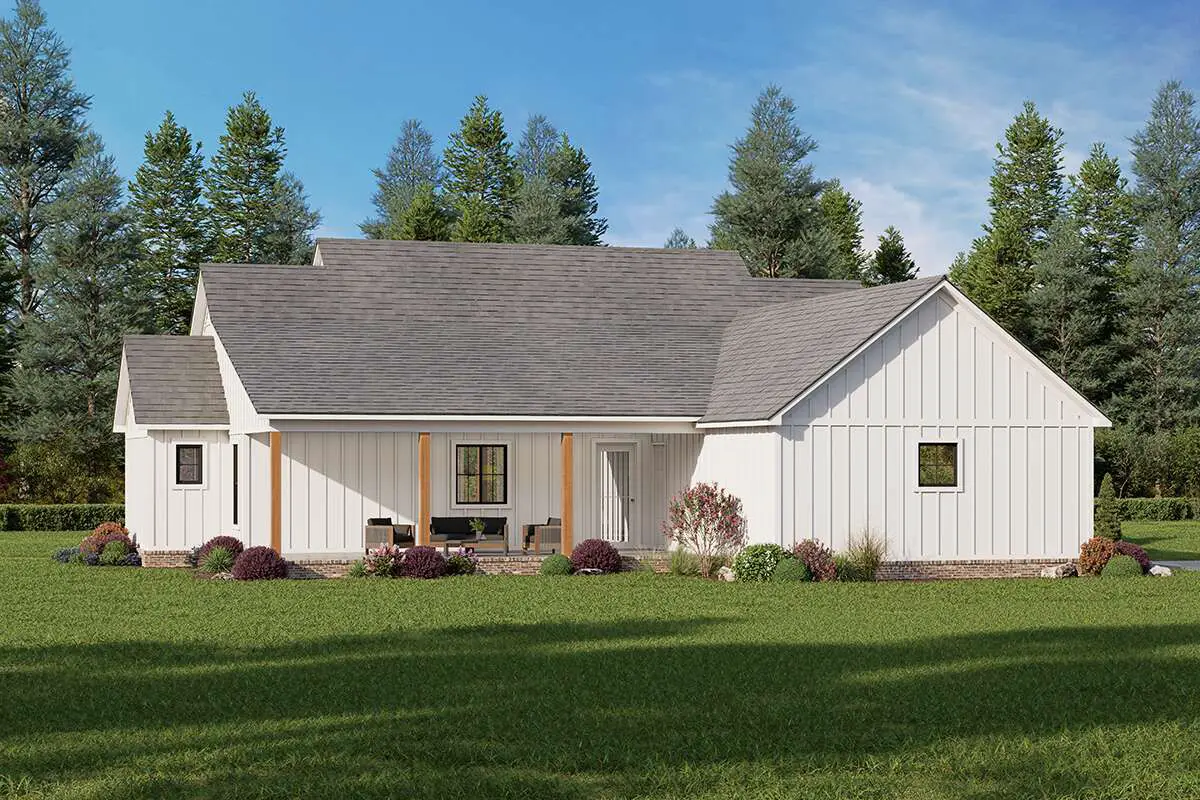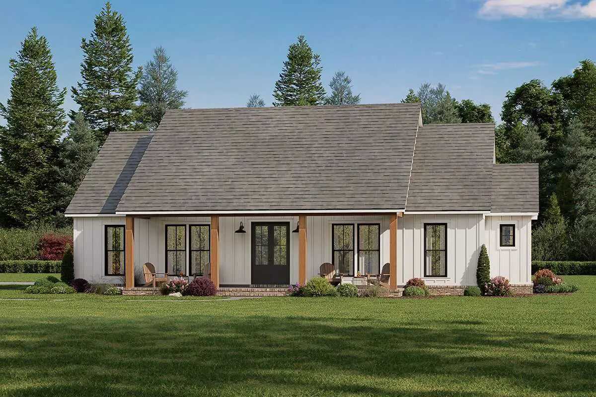 This warm, efficient modern farmhouse spans about 1,872 sq ft on one level. It includes 3 bedrooms, 2 full baths, and 1 half bath, with a 2-car garage and generous covered porches that enhance its charm and livability.