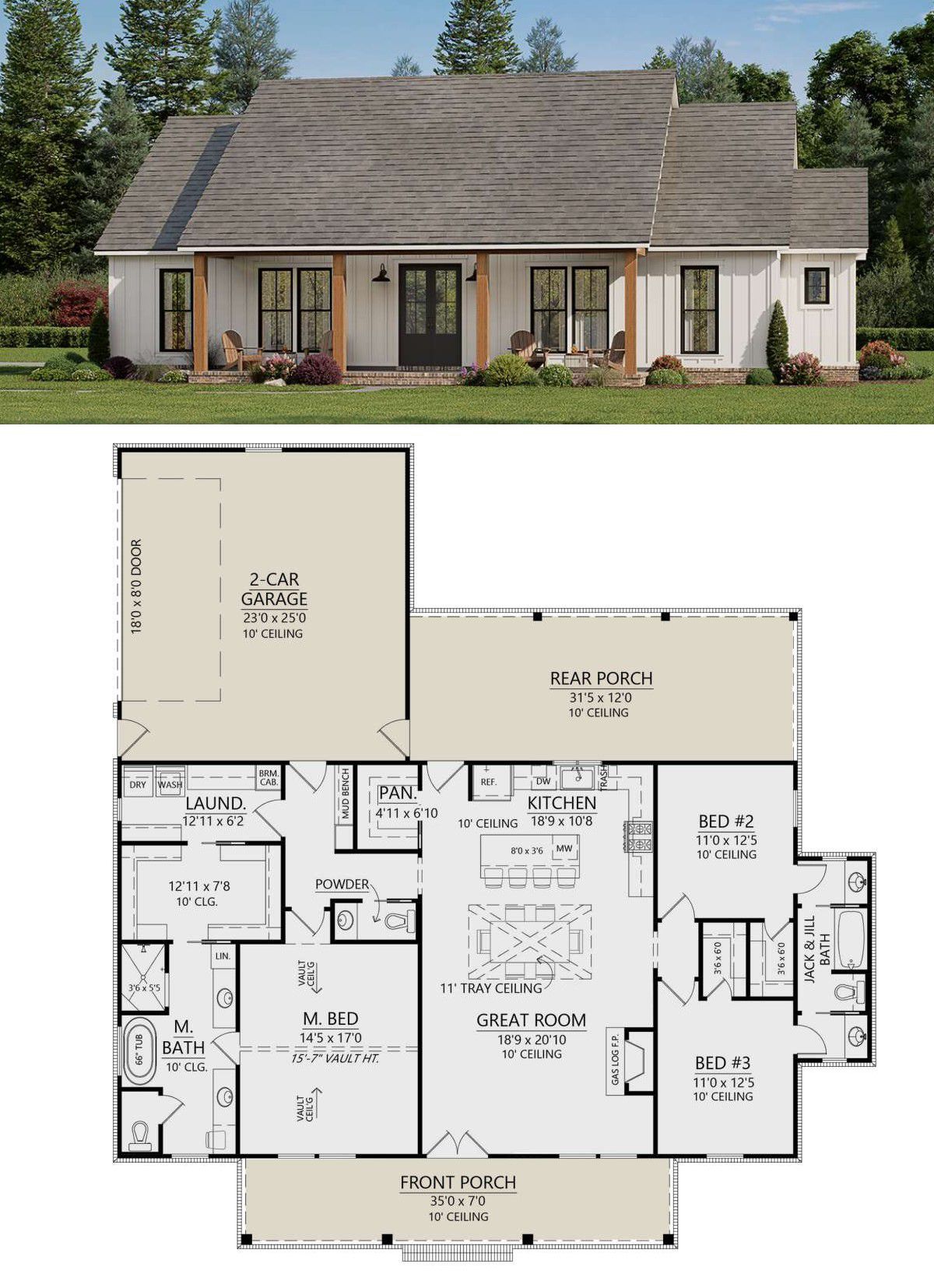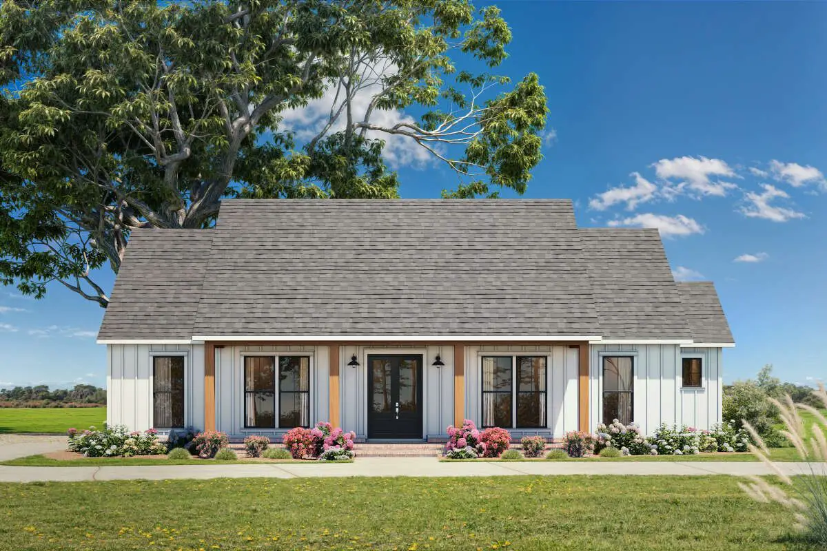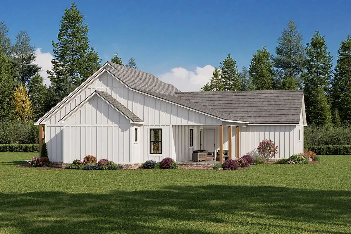 This warm, efficient modern farmhouse spans about 1,872 sq ft on one level. It includes 3 bedrooms, 2 full baths, and 1 half bath, with a 2-car garage and generous covered porches that enhance its charm and livability.