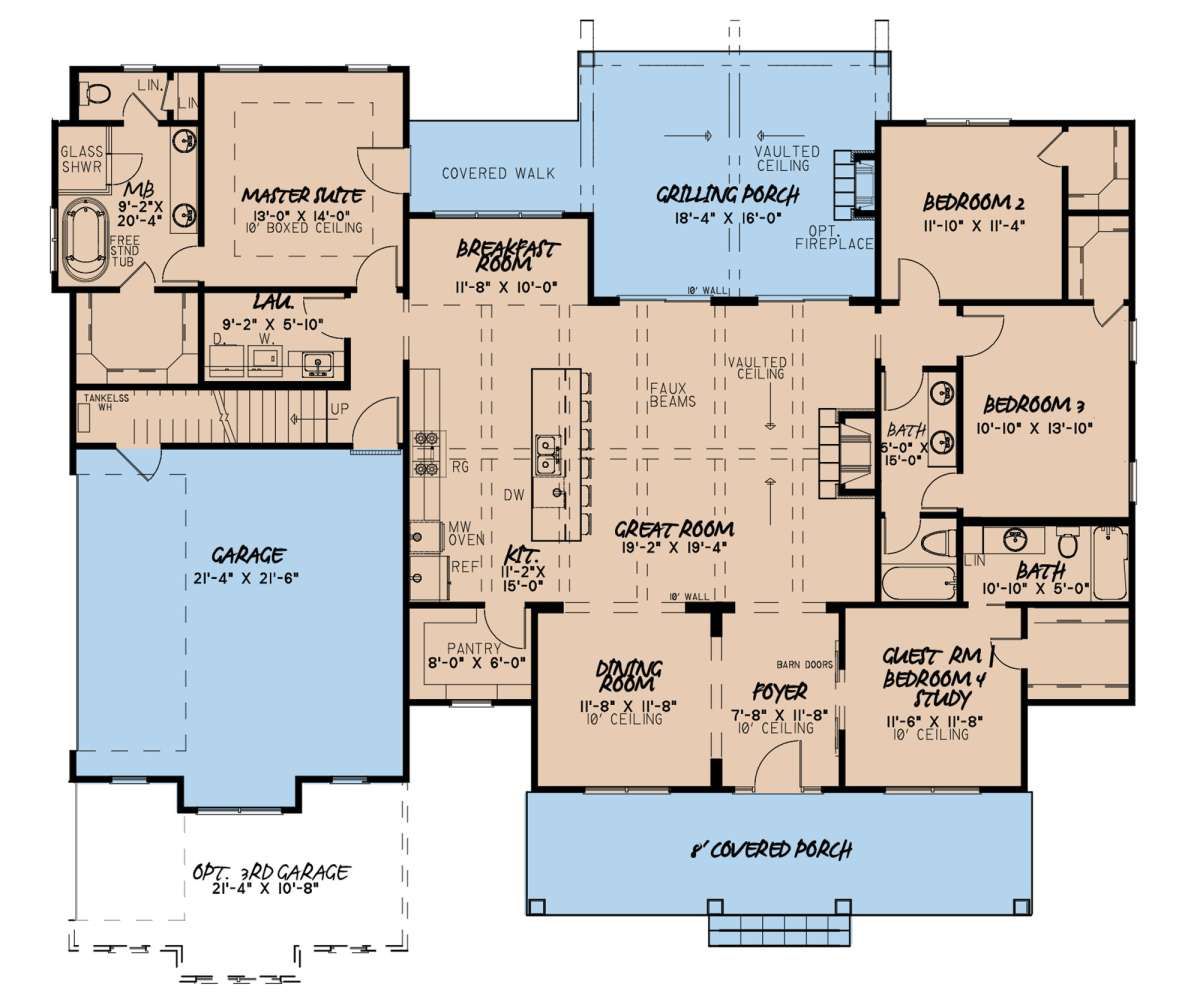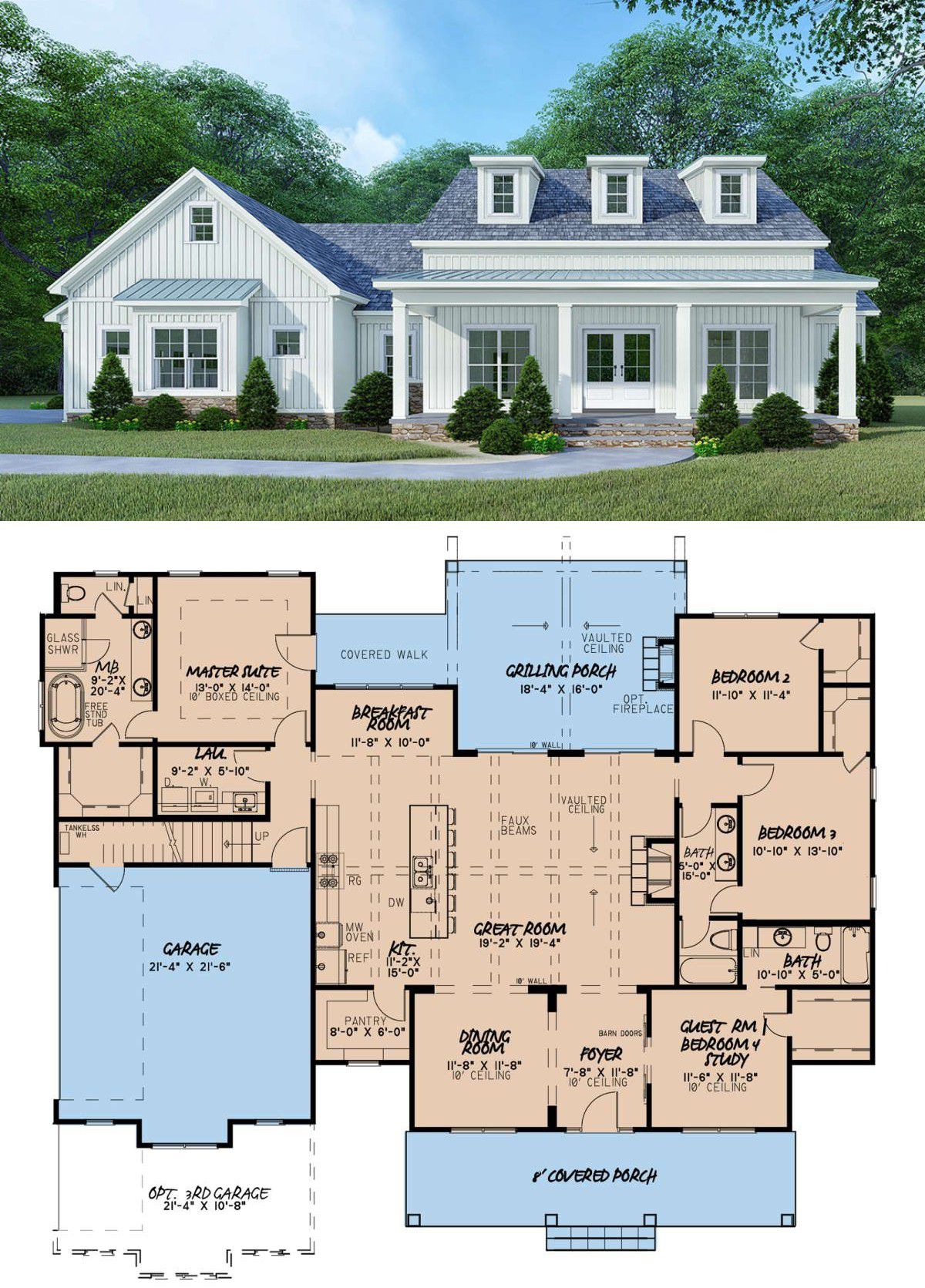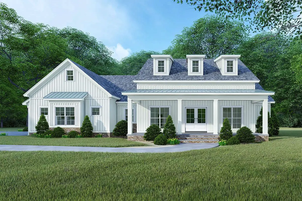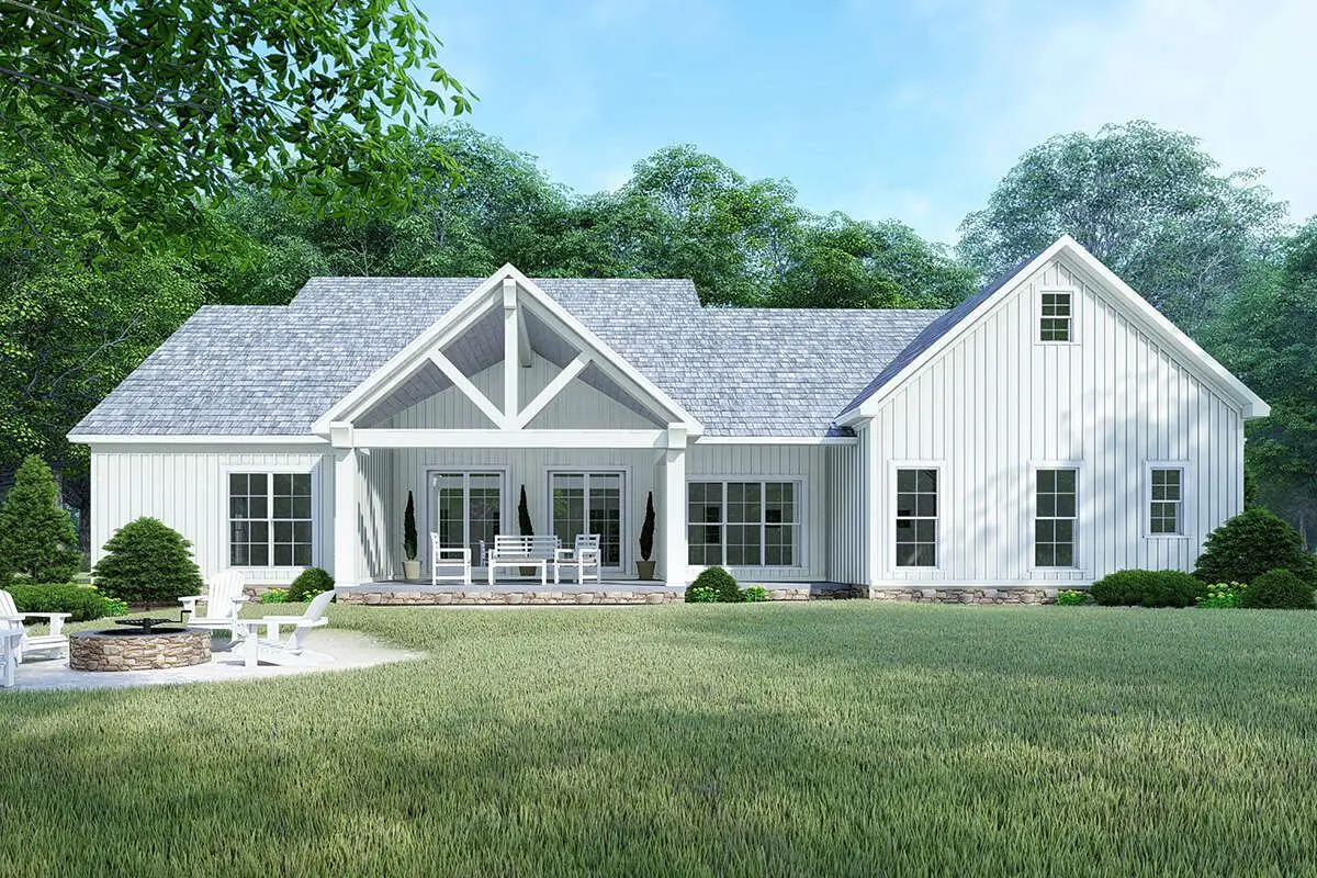 This modern farmhouse design offers about 2,220 sq ft of efficient, comfortable living.