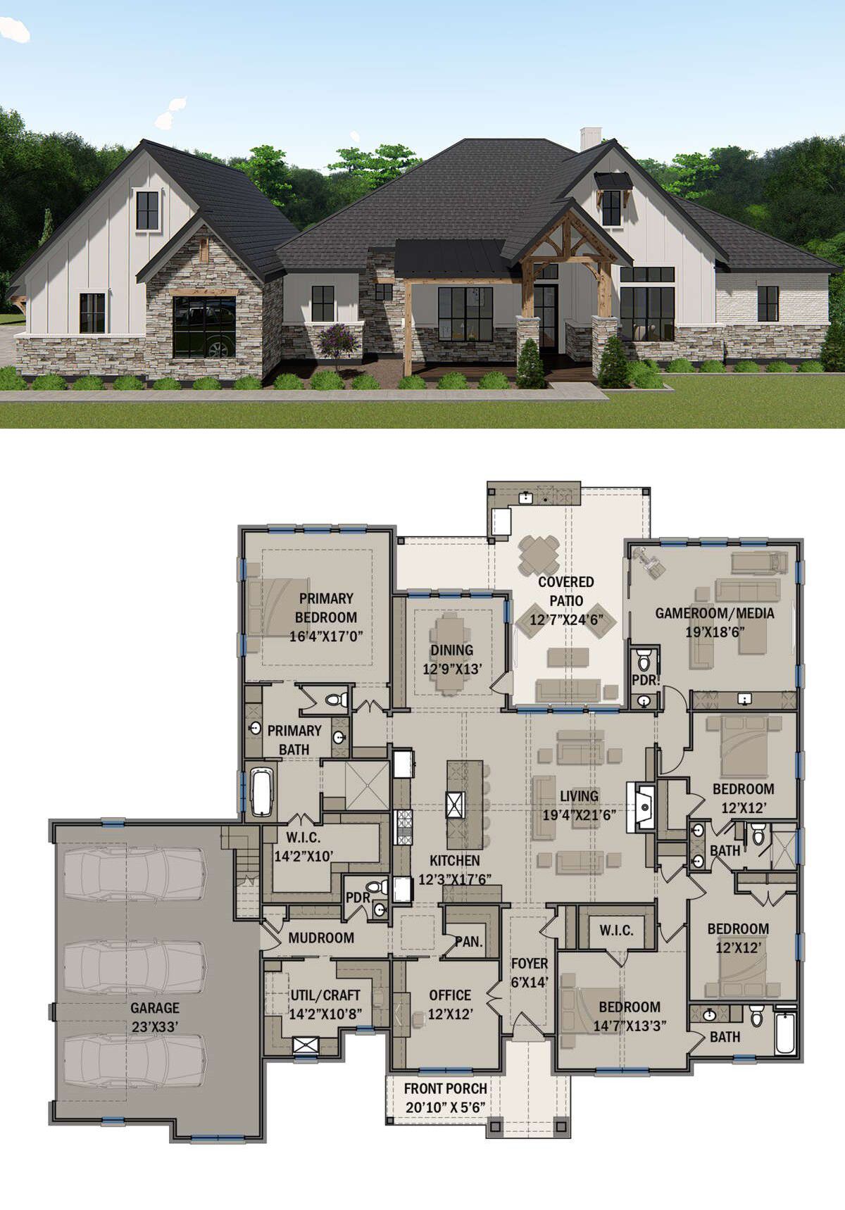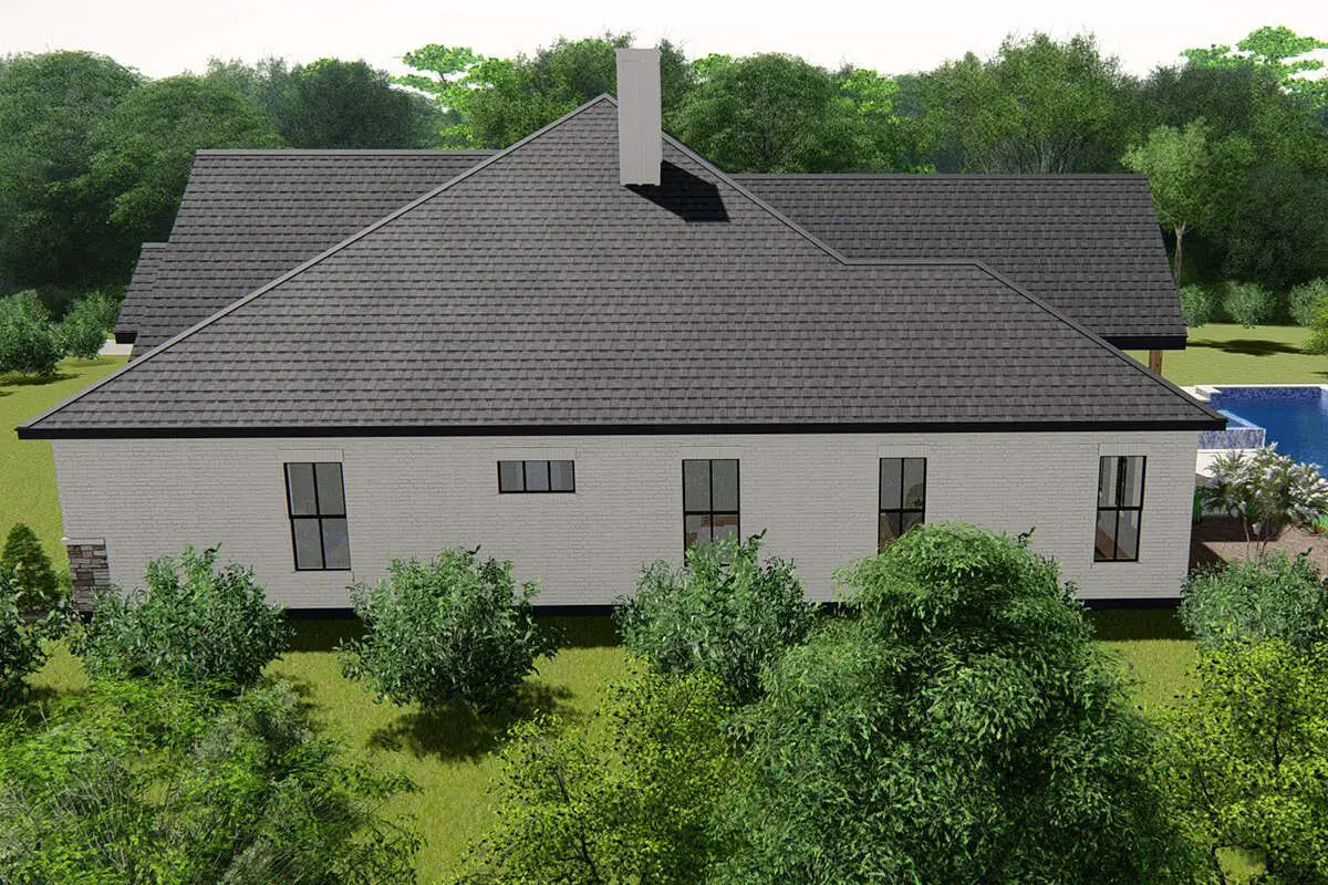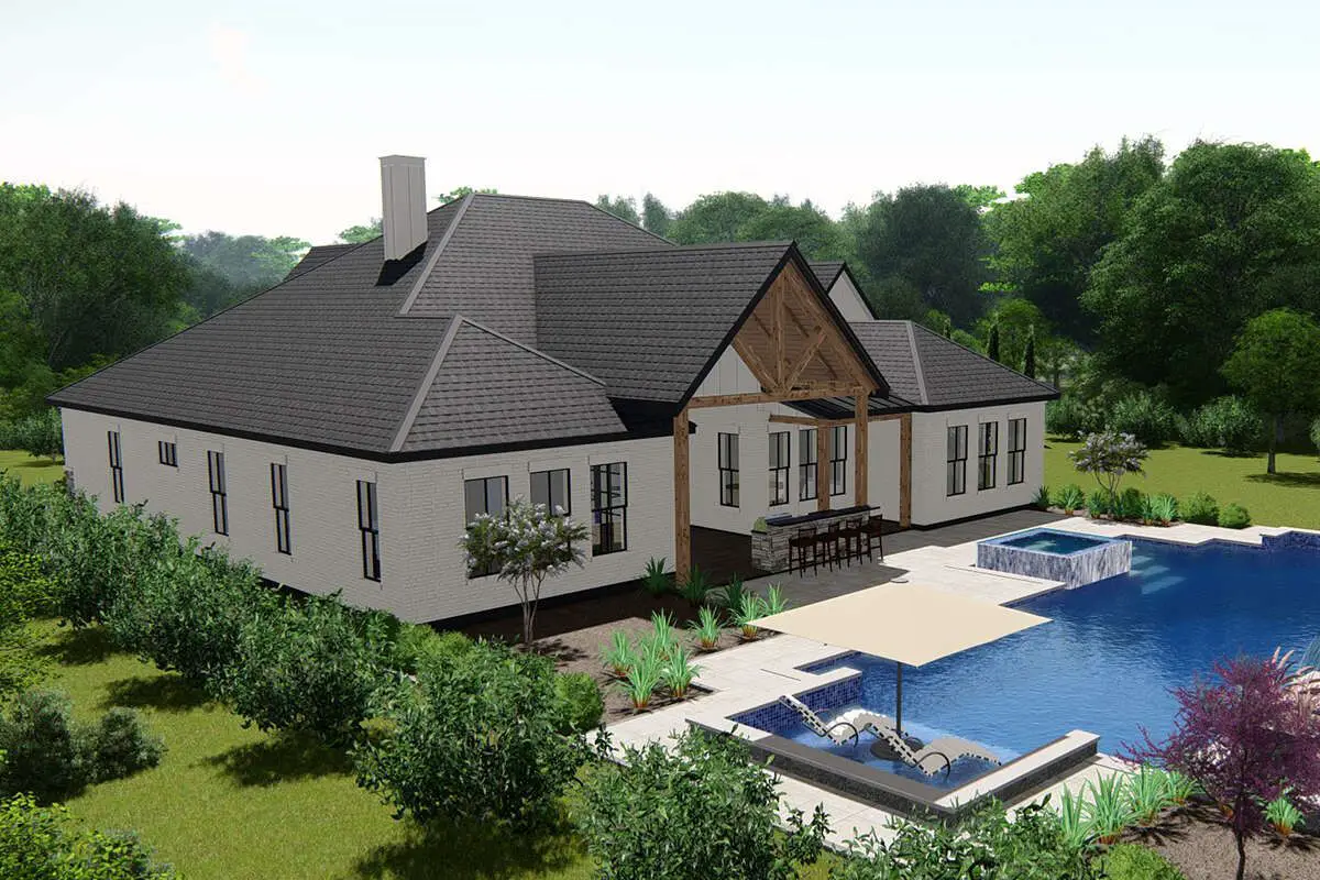 This modern farmhouse plan delivers about 3,414 sq ft of comfortable, stylish living. With **4 bedrooms**, **4 full baths**, open living zones, and clean modern detail, it’s designed for both family flow and refined daily life.