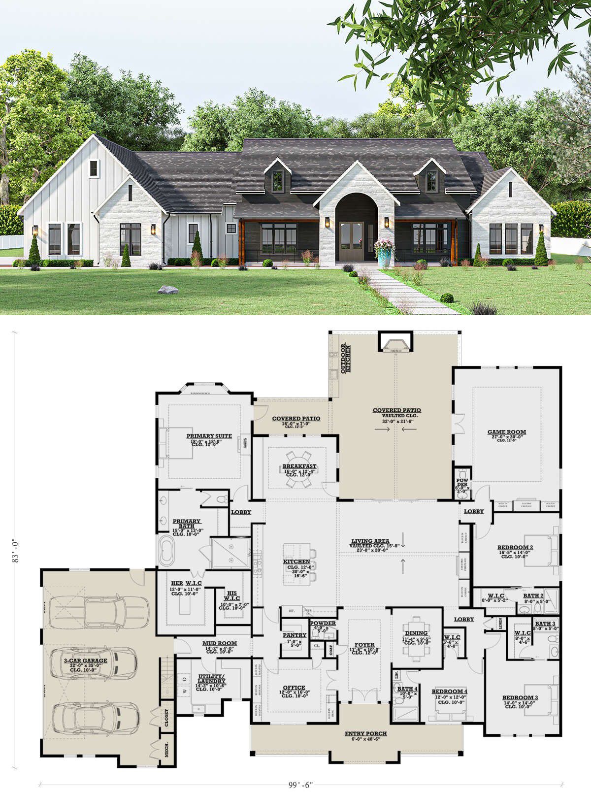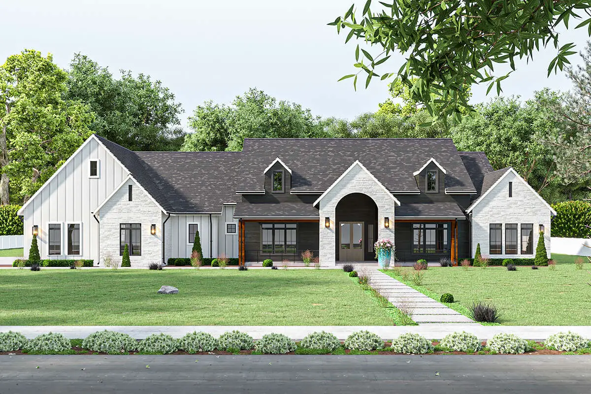 This striking modern farmhouse plan brings together **~4,187 sq ft** of refined space, offering **4 bedrooms**, **4 full baths**, **2 half baths**, and a **3-car garage**.