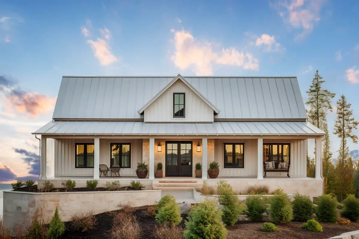 The exterior blends classic farmhouse lines with modern materials: clean siding, simple roof pitches, and strong geometry. A generous covered front porch sets a welcoming tone, and the side-entry garage keeps the driveway aesthetic clean. 1