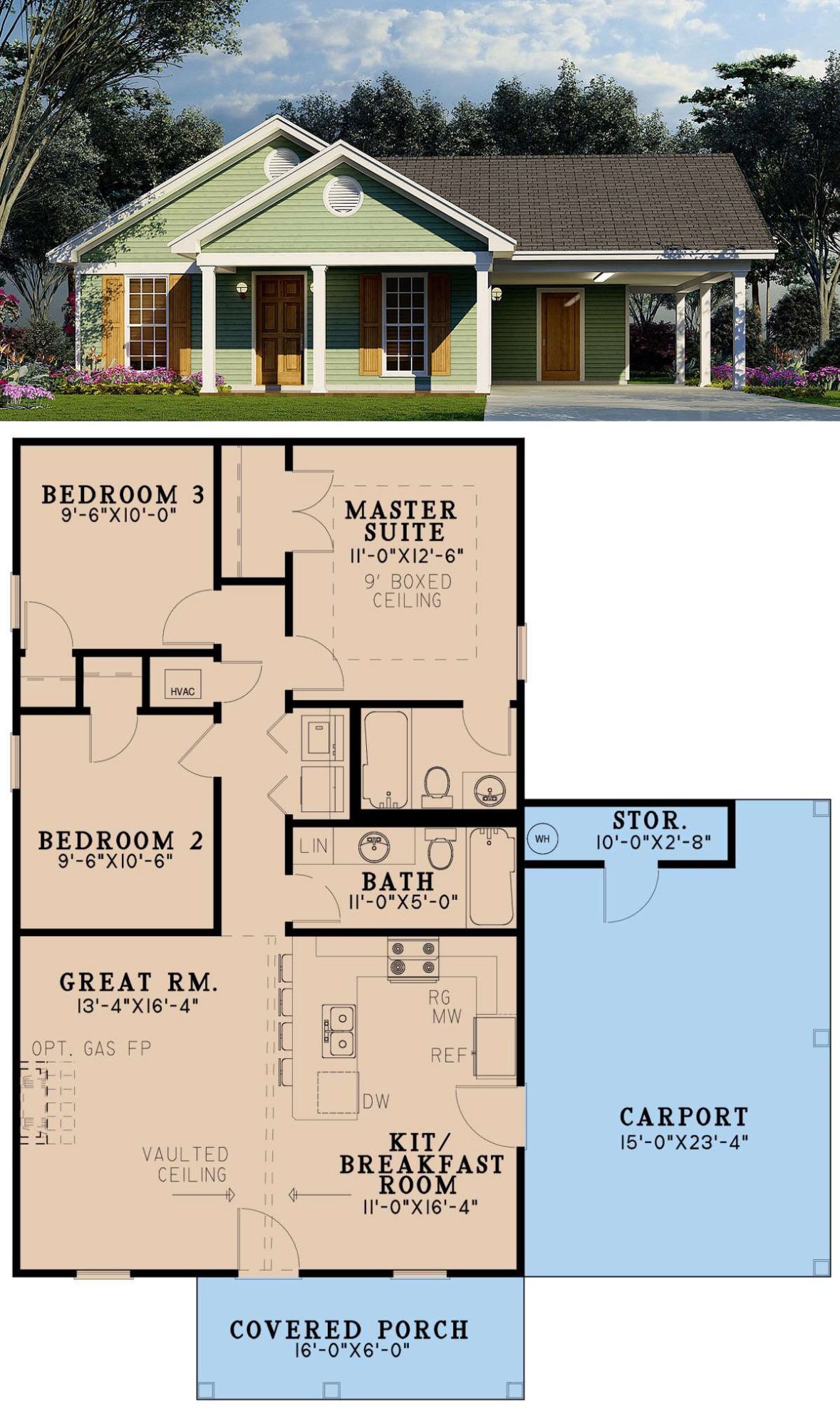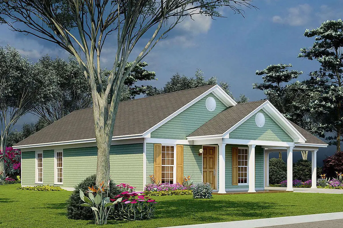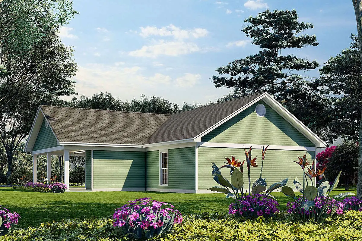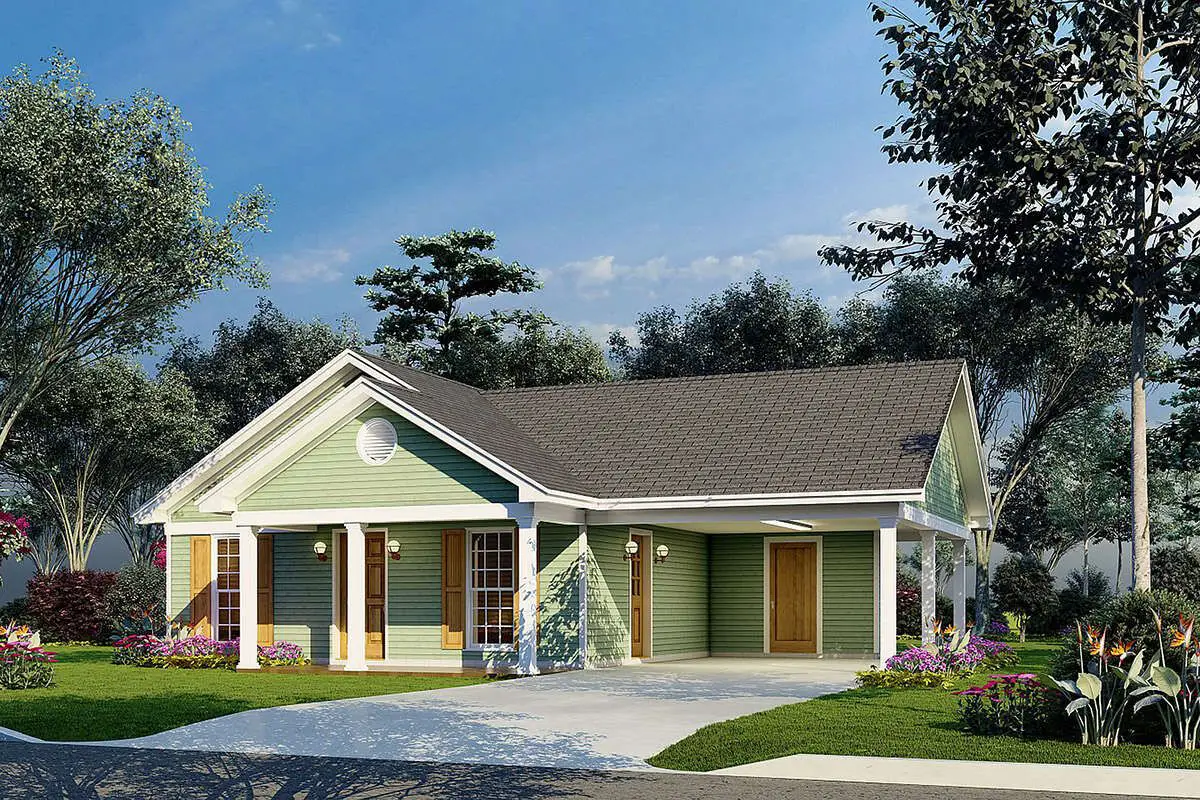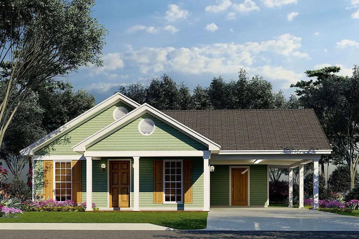 This compact traditional plan delivers about 1,025 sq ft of living space with 3 bedrooms, 2 bathrooms, and a 1-car garage.