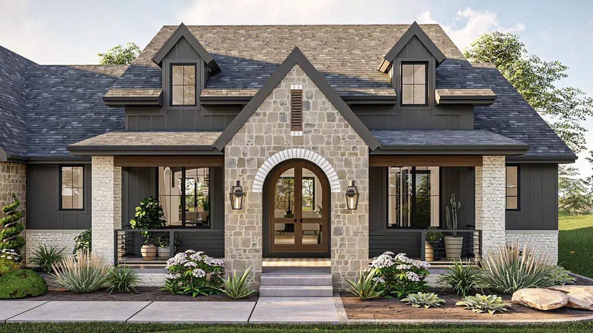 A blend of board-and-batten siding and two types of stone create layered texture and curb appeal.
