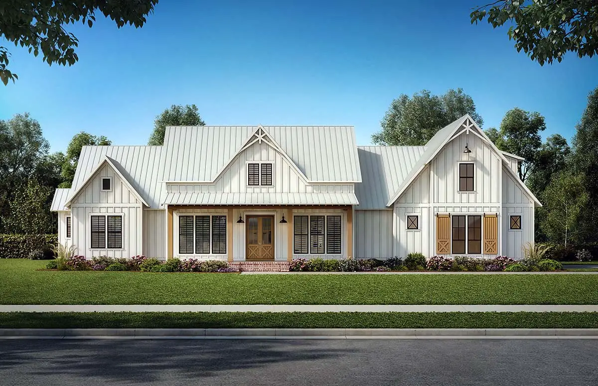 Styled as a modern farmhouse, the exterior blends vertical siding and warm wood accents, with a welcoming front porch.3 A deep rear porch (1005 sq ft) with vaulted ceiling, grilling area, and an outdoor fireplace anchors outdoor living.4