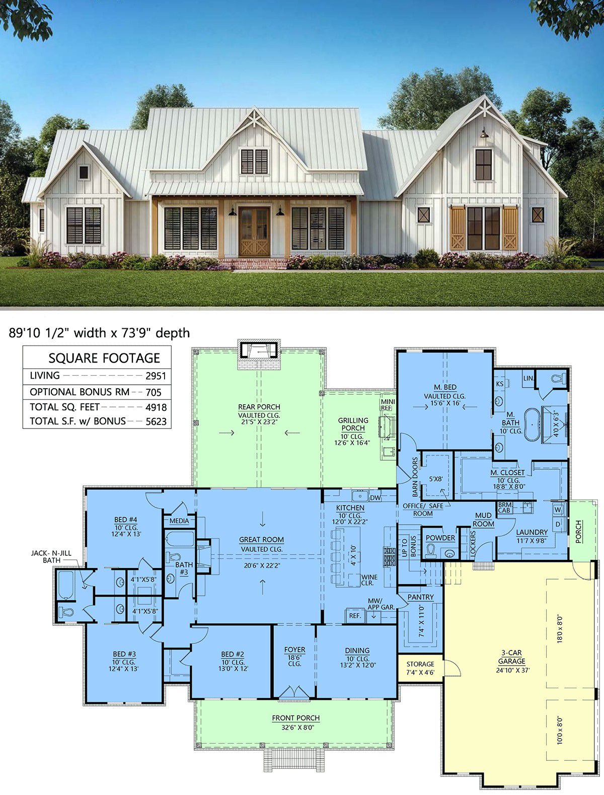 This plan offers about 2,951 sq ft of heated main-level living, with 4 bedrooms, 3 full baths + 1 half bath, and an attached 3-car garage.